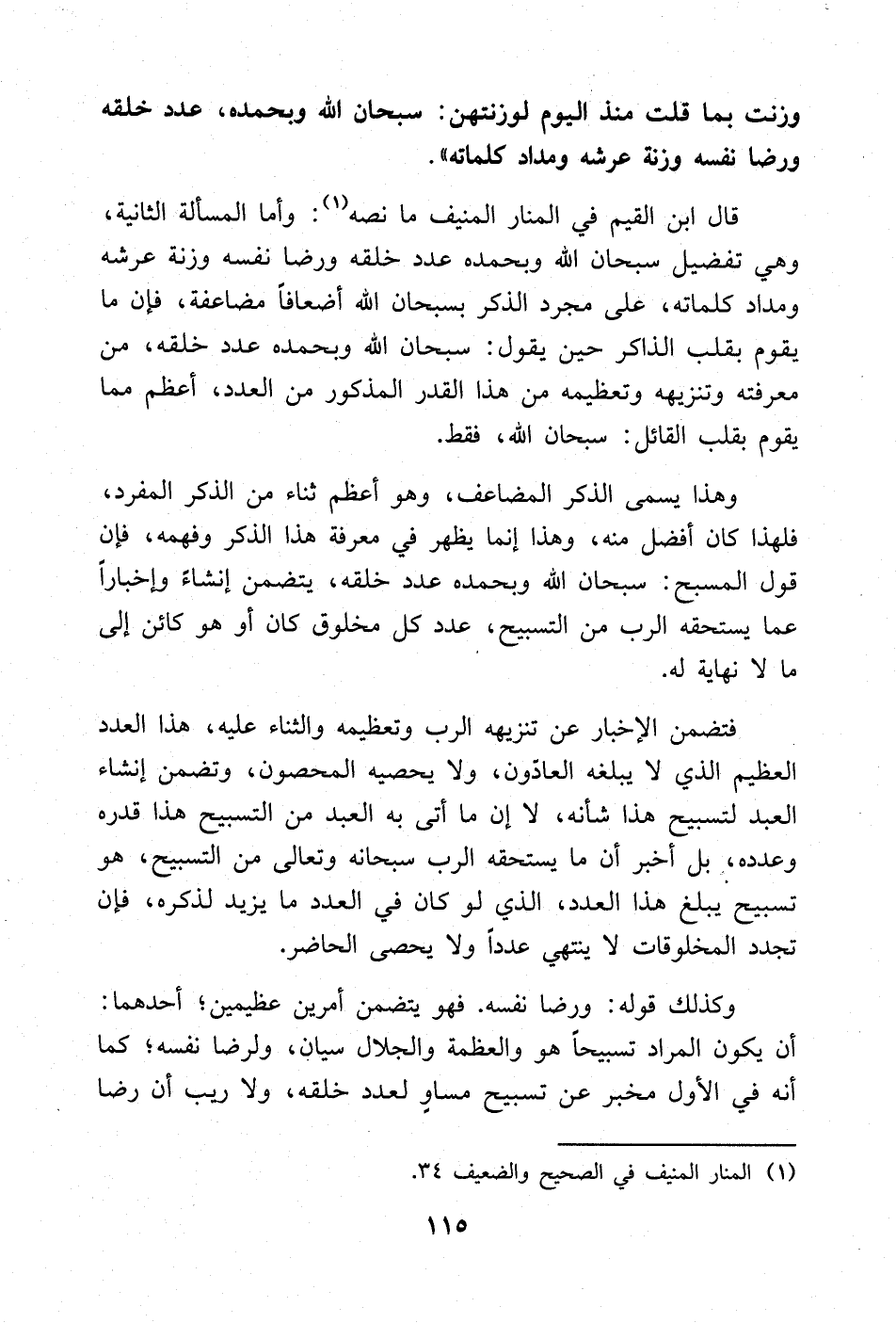 قال ابن القيم في المنار المنيف ما نصه: (¬1) وأما المسألة الثانية، وهي تفضيل سبحان الله وبحمده عدد خلقه ورضا نفسه وزنة عرشه ومداد كلماته، على مجرد الذكر بسبحان الله أضعافًا مضاعفة، فإن ما يقوم بقلب الذاكر حين يقول سبحان الله وبحمده عدد خلقه، من معرفته وتنزيهه وتعظيمه من هذا القدر المذكور من العدد، أعظم مما يقوم بقلب القائل سبحان الله فقط.