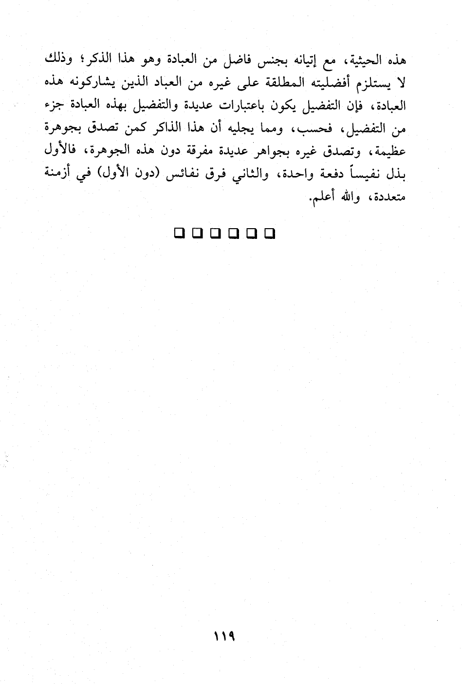 هذه الحيثية، مع إتيانه بجنس فاضل من العبادة وهو هذا الذكر؛ وذلك لا يستلزم أفضليته المطلقة على غيره من العباد الذين يشاركونه هذه العبادة، فإن التفضيل يكون باعتبارات عديدة والتفضيل بهذه العبادة جزء من التفضيل، فحسب، ومما يجليه أن هذا الذاكر كمن تصدق بجوهرة عظيمة، وتصدق غيره بجواهر عديدة مفرقة دون هذه الجوهرة فالأول بذل نفيسا دفعة واحدة، والثاني فرق نفائس (دون الأول) في أزمنة متعددة؛ والله أعلم.