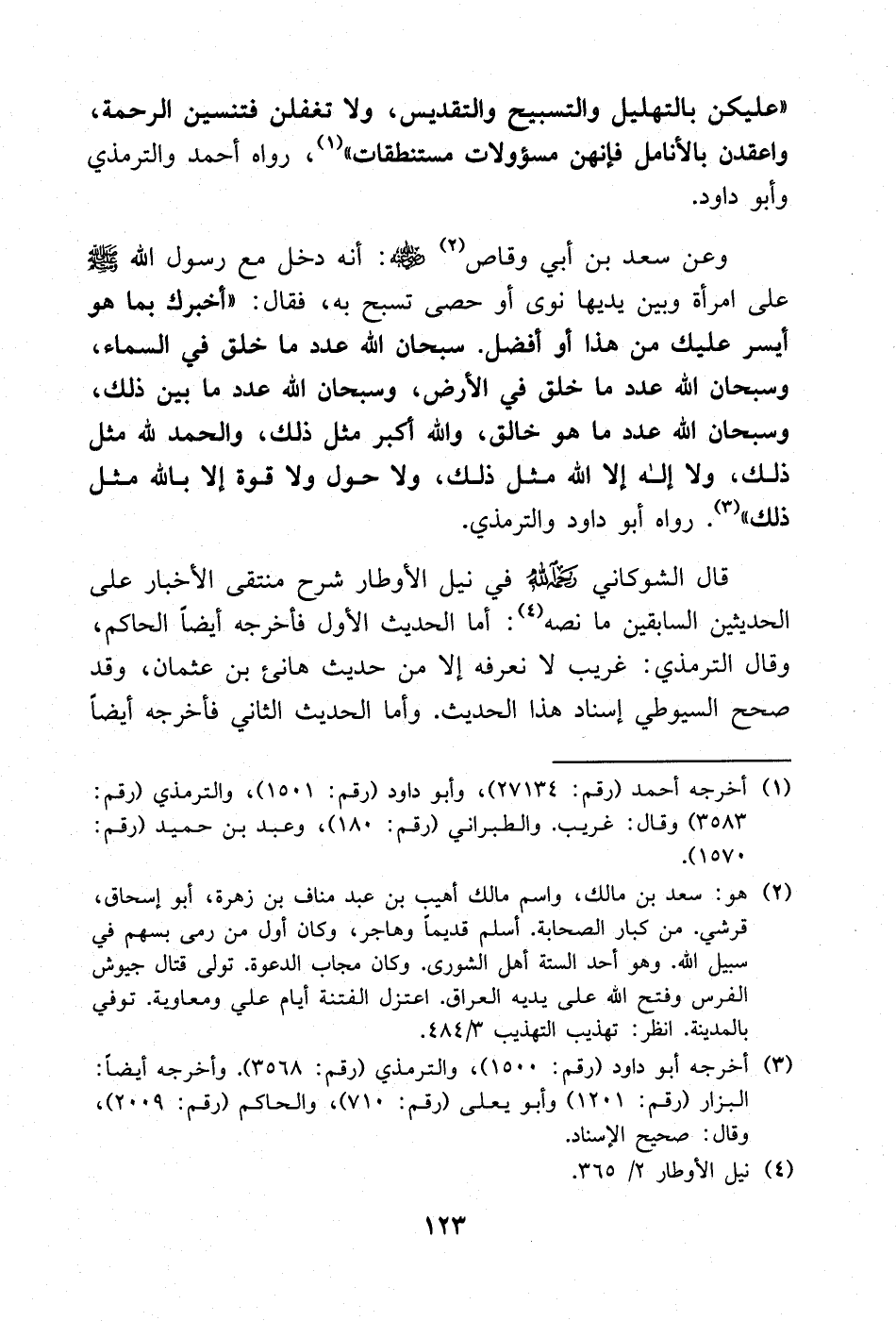 وعن سعد بن أبي وقاص (¬2) - رضي الله عنه -: أنه دخل مع رسول الله - صلى الله عليه وسلم - على امرأة وبين يديها نوى أو حصى تسبح به، فقال: «أخبرك بما هو أيسر عليك من هذا أو أفضل. سبحان الله عدد ما خلق في السماء، وسبحان الله عدد ما خلق في الأرض، وسبحان الله عدد ما بين ذلك، وسبحان الله عدد ما هو خالق، والله أكبر مثل ذلك، والحمد لله مثل ذلك، ولا إله إلا الله مثل ذلك، ولا حول ولا قوة إلا بالله مثل ذلك». (¬3) رواه أبو داود والترمذي.