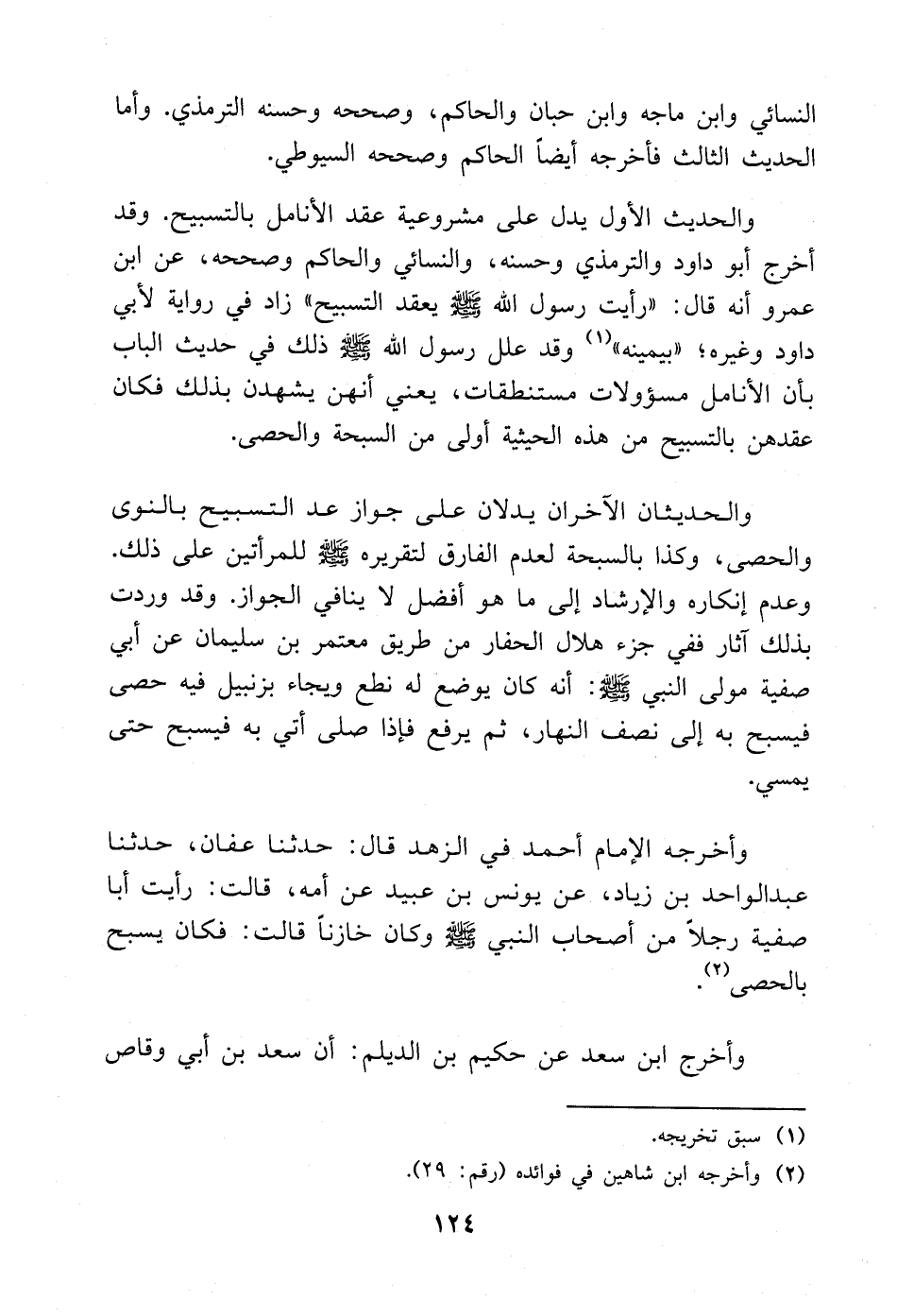 والحديث الأول يدل على مشروعية عقد الأنامل بالتسبيح. وقد أخرج أبو داود والترمذي وحسنه والنسائي والحاكم وصححه عن ابن عمرو أنه قال: «رأيت رسول الله - صلى الله عليه وسلم - يعقد التسبيح» زاد في رواية لأبي داود وغيره «بيمينه» (¬1) وقد علل رسول الله - صلى الله عليه وسلم - ذلك في حديث الباب بأن الأنامل مسئولات مستنطقات، يعني أنهن يشهدن بذلك فكان عقدهن بالتسبيح من هذه الحيثية أولى من السبحة والحصى.