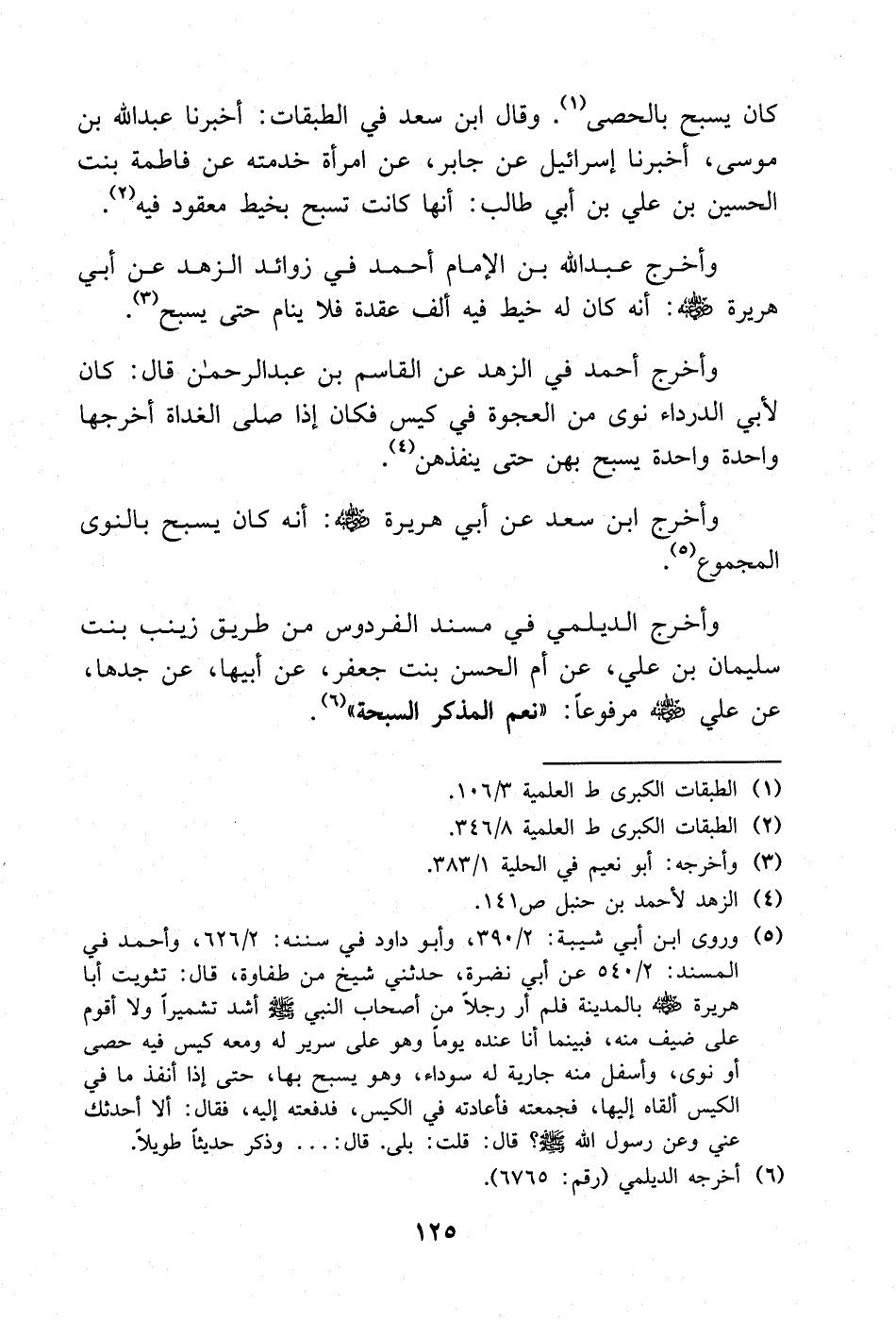 وأخرج أحمد في الزهد عن القاسم بن عبد الرحمن قال: كان لأبي الدرداء نوى من العجوة في كيس فكان إذا صلى الغداة أخرجها واحدة واحدة يسبح بهن حتى ينفذهن. (¬4) وأخرج ابن سعد عن أبي هريرة - رضي الله عنه -: أنه كان يسبح بالنوى المجموع. (¬5) وأخرج الديلمي في مسند الفردوس من طريق زينب بنت سليمان بن علي عن أم الحسن بنت جعفر عن أبيها عن جدها عن علي - رضي الله عنه - مرفوعا: «نعم المذكر السبحة» (¬6).