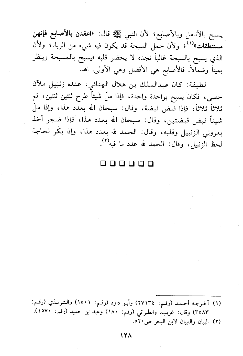 لطيفة: كان عبد الملك بن هلال الهنائي، عنده زنبيل ملآن حصى، فكان يسبح بواحدة واحدة، فإذا مل شيئًا طرح ثنتين ثنتين، ثم ثلاثًا ثلاثًا، فإذا قبض قبضة وقال سبحان الله بعدد هذا، وإذا مل شيئا قبض قبضتين وقال سبحان الله بعدد هذا، فإذا ضجر أخذ بعروتي الزنبيل وقلبه، وقال الحمد لله بعدد هذا، وإذا بكّر لحاجة لحظ الزنبيل، وقال الحمد لله عدد ما فيه. (¬2)