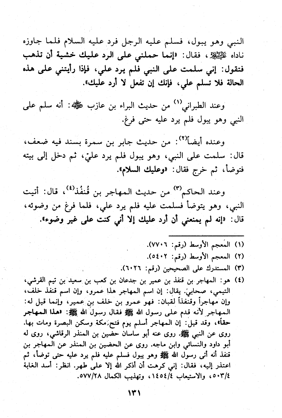 النبي وهو يبول، فسلم عليه الرجل فرد - عليه السلام - فلما جاوزه ناداه - عليه السلام -، فقال: «إنما حملني على الرد عليك خشية أن تذهب فتقول: إني سلمت على النبي فلم يرد علي، فإذا رأيتني على هذه الحالة فلا تسلم علي، فإنك إن تفعل لا أرد عليك».