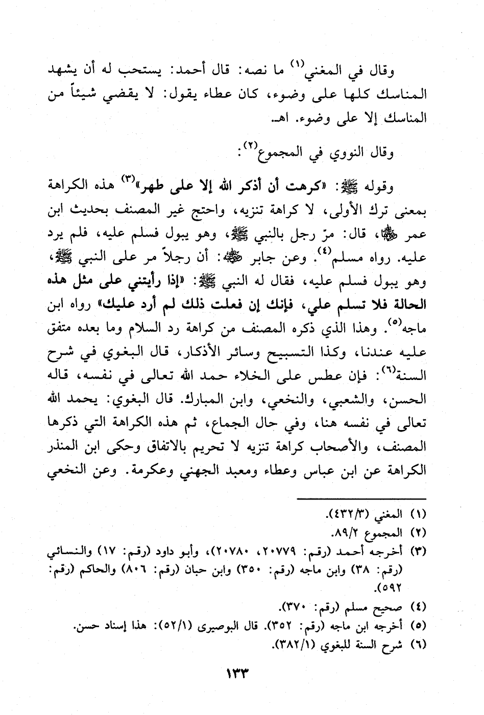 وقوله - صلى الله عليه وسلم -: «كرهت أن أذكر الله إلا على طهر» (¬3) هذه الكراهة بمعنى ترك الأولى، لا كراهة تنزيه، واحتج غير المصنف بحديث ابن عمر - رضي الله عنه -، قال: مر رجل بالنبي - صلى الله عليه وسلم - وهو يبول فسلم عليه فلم يرد عليه. رواه مسلم. (¬4) وعن جابر - رضي الله عنه -: أن رجلًا مر على النبي - صلى الله عليه وسلم - وهو يبول فسلم عليه، فقال له النبي - صلى الله عليه وسلم -: «إذا رأيتني على مثل هذه الحالة فلا تسلم علي، فإنك إن فعلت ذلك لم أرد عليك» [رواه ابن ماجه]. (¬5) وهذا الذي ذكره المصنف من كراهة رد السلام وما بعده متفق عليه عندنا، وكذا التسبيح وسائر الأذكار، قال البغوي في شرح السنة: (¬6) فإن عطس على الخلاء حمد الله تعالى في نفسه، قاله الحسن، والشعبي، والنخعي، وابن المبارك. قال البغوي يحمد الله تعالى في نفسه هنا، وفي حال الجماع، ثم هذه الكراهة التي ذكرها المصنف، والأصحاب كراهة تنزيه لا تحريم بالاتفاق وحكى ابن المنذر الكراهة عن ابن عباس وعطاء ومعبد الجهني وعكرمة: وعن النخعي