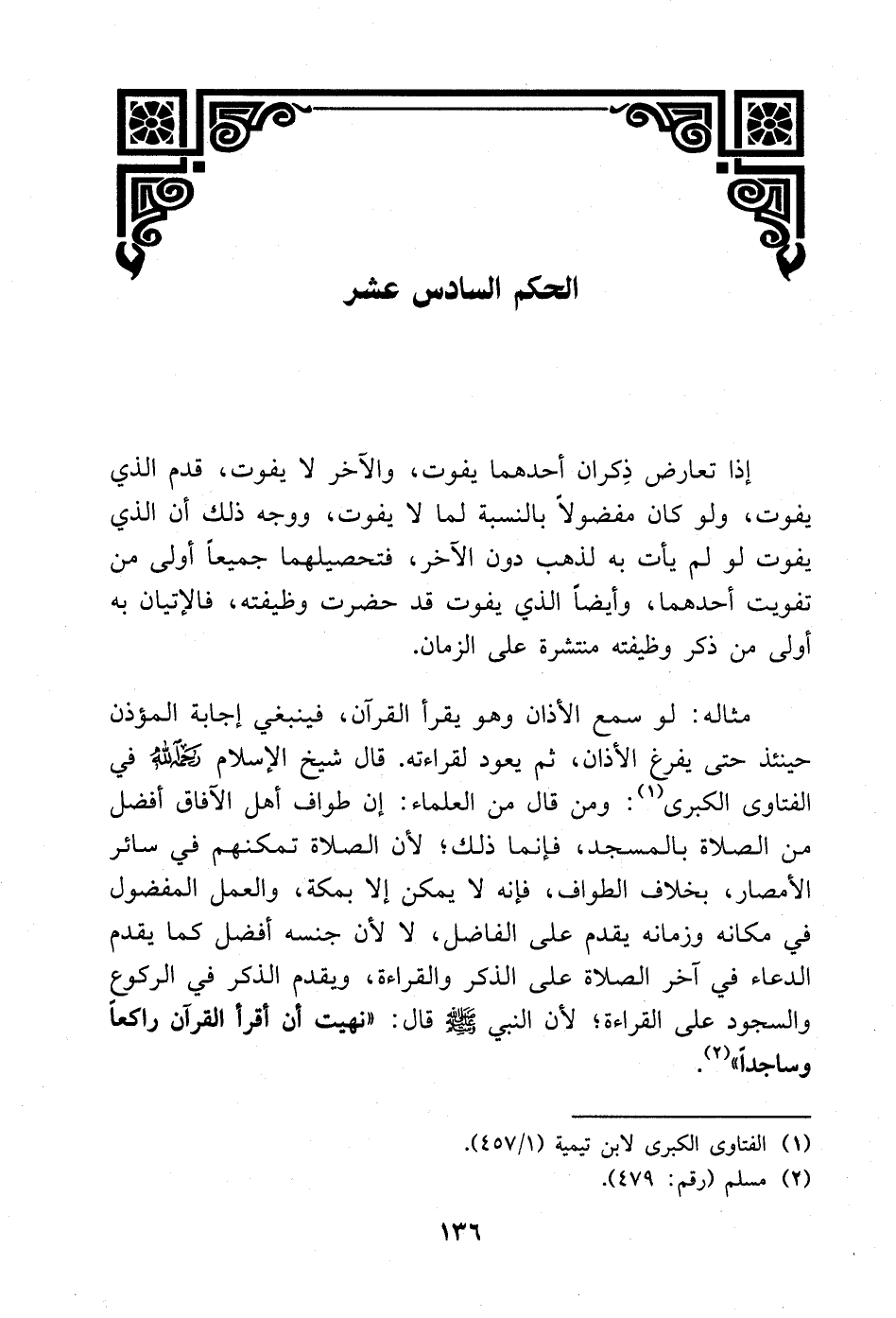 مثاله: لو سمع الأذان وهو يقرأ القرآن، فينبغي إجابة المؤذن حينئذ حتى يفرغ الأذان، ثم يعود لقراءته. قال شيخ الإسلام - رحمه الله - في الفتاوى الكبرى: (¬1) ومن قال من العلماء: إن طواف أهل الآفاق أفضل من الصلاة بالمسجد، فإنما ذلك لأن الصلاة تمكنهم في سائر الأمصار، بخلاف الطواف، فإنه لا يمكن إلا بمكة، والعمل المفضول في مكانه وزمانه يقدم على الفاضل، لا لأن جنسه أفضل كما يقدم الدعاء في آخر الصلاة على الذكر والقراءة، ويقدم الذكر في الركوع والسجود على القراءة؛ لأن النبي - صلى الله عليه وسلم - قال: «نهيت أن أقرأ القرآن راكعًا وساجدًا». (¬2)