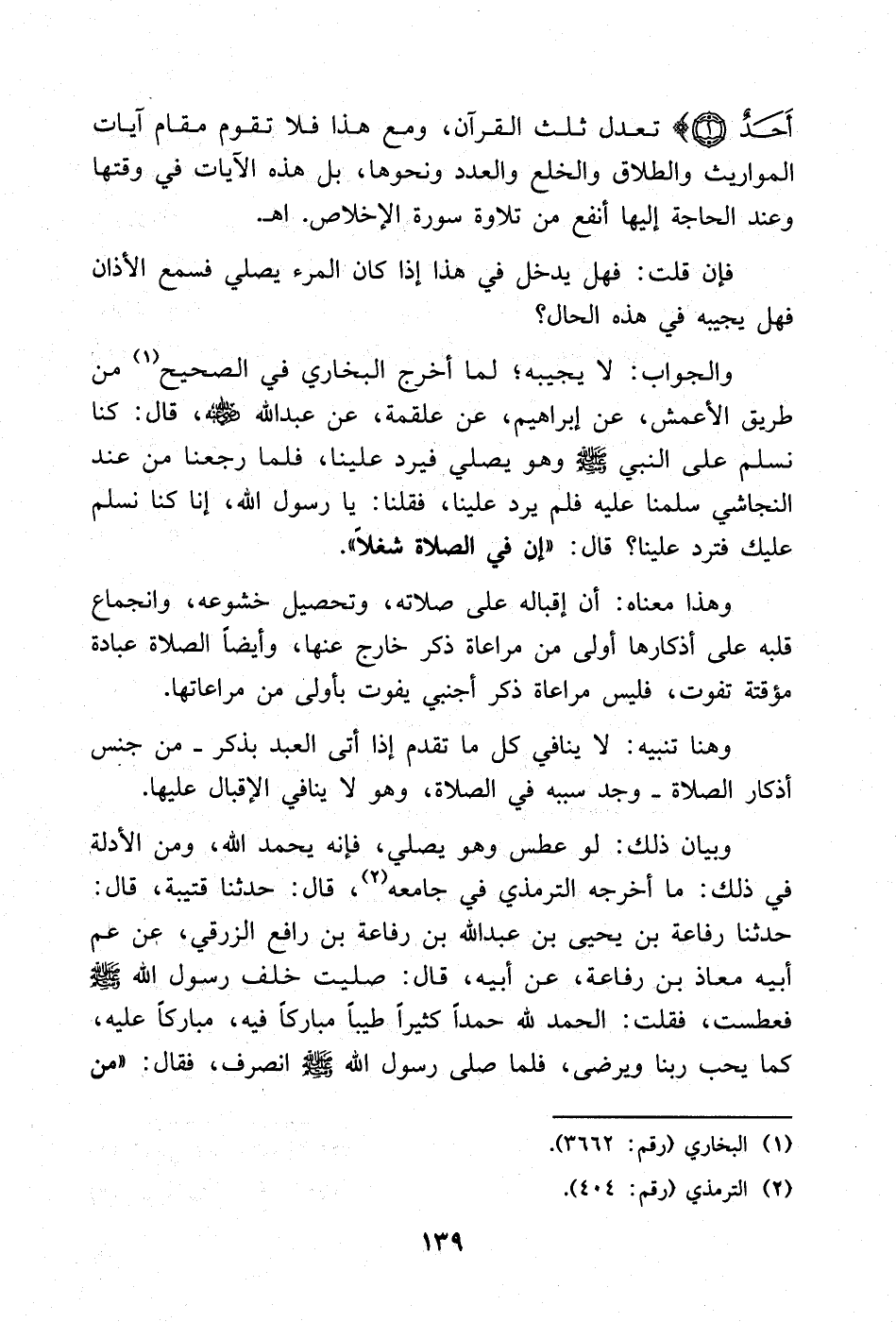 وبيان ذلك: لو عطس وهو يصلي، فإنه يحمد الله، ومن الأدلة في ذلك: ما أخرجه الترمذي في جامعه (¬2) قال: حدثنا قتيبة قال: حدثنا رفاعة بن يحيى بن عبد الله بن رفاعة بن رافع الزرقي، عن عم أبيه معاذ بن رفاعة، عن أبيه، قال: صليت خلف رسول الله - صلى الله عليه وسلم - فعطست، فقلت: الحمد لله حمدًا كثيرًا طيبًا مباركًا فيه، مباركًا عليه، كما يحب ربنا ويرضى، فلما صلى رسول الله - صلى الله عليه وسلم - انصرف، فقال: «من