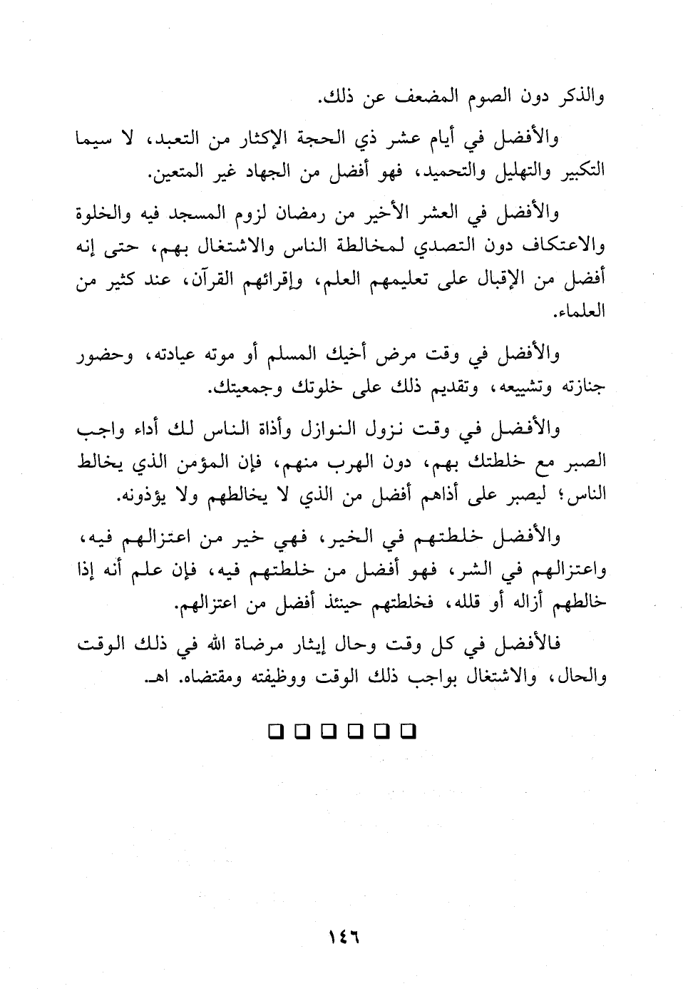 فالأفضل في كل وقت وحال إيثار مرضاة الله في ذلك الوقت والحال، والاشتغال بواجب ذلك الوقت ووظيفته ومقتضاه. ا. هـ.