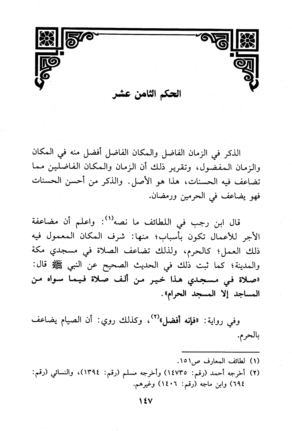 قال ابن رجب في اللطائف ما نصه: (¬1) واعلم أن مضاعفة الأجر للأعمال تكون بأسباب منها: شرف المكان المعمول فيه ذلك العمل؛ كالحرم، ولذلك تضاعف الصلاة في مسجدي مكة والمدينة؛ كما ثبت ذلك في الحديث الصحيح عن النبي - صلى الله عليه وسلم - قال: «صلاة في مسجدي هذا خير من ألف صلاة فيما سواه من المساجد إلا المسجد الحرام».