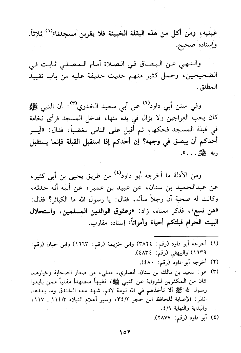 ومن الأدلة ما أخرجه أبو داود (¬4) من طريق يحيى بن أبي كثير، عن عبد الحميد بن سنان، عن عبيد بن عمير، عن أبيه أنه حدثه، وكانت له صحبة أن رجلا سأله، فقال: يا رسول الله ما الكبائر؟ فقال: «هن تسع»، فذكر معناه زاد: «وعقوق الوالدين المسلمين، واستحلال البيت الحرام قبلتكم أحياء وأمواتًا» إسناده مقارب.