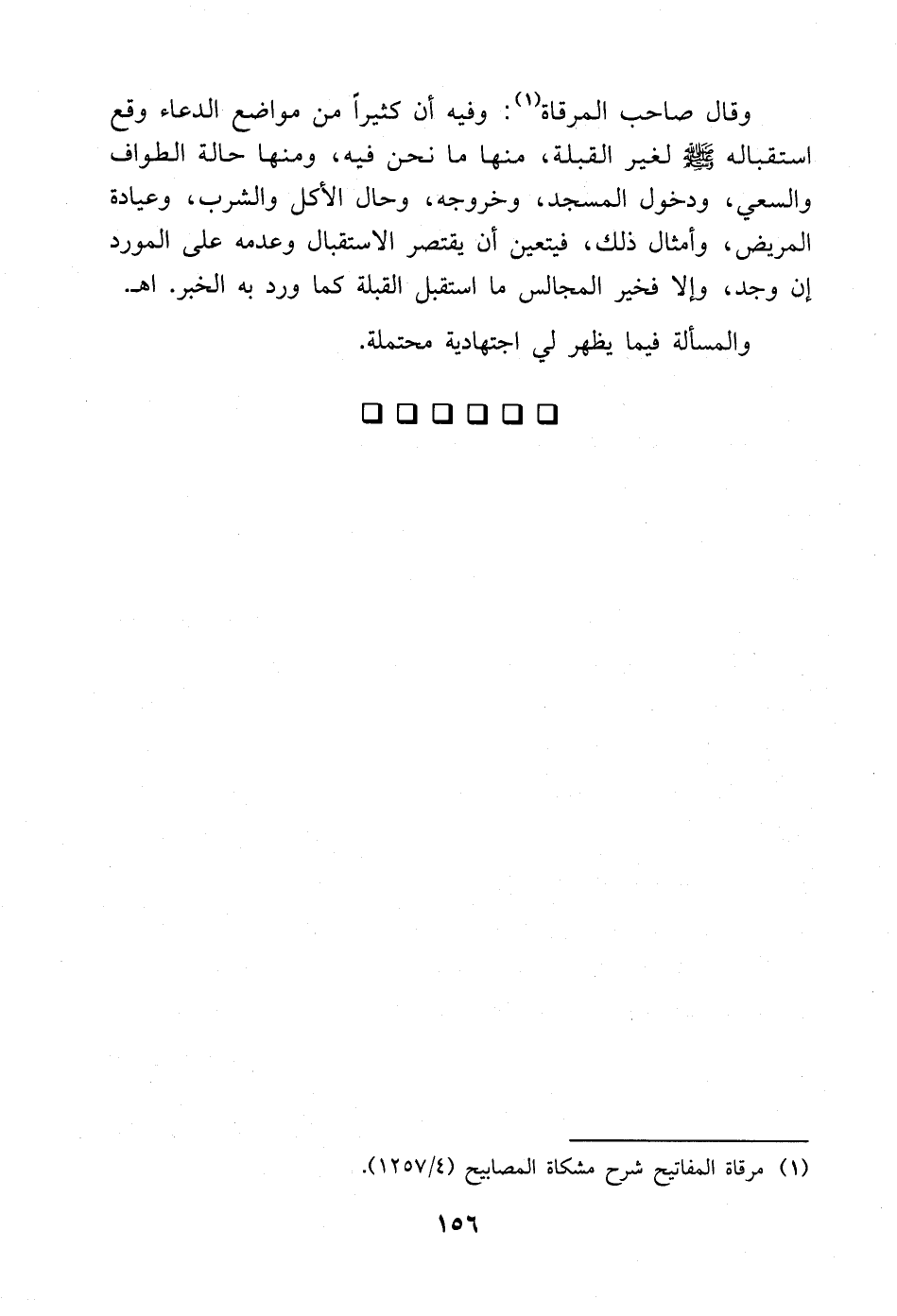 وقال صاحب المرقاة: (¬1) وفيه أن كثيرا من مواضع الدعاء وقع استقباله - صلى الله عليه وسلم - لغير القبلة منها ما نحن فيه، ومنها حالة الطواف والسعي، ودخول المسجد، وخروجه، وحال الأكل والشرب، وعيادة المريض، وأمثال ذلك، فيتعين أن يقتصر الاستقبال وعدمه على المورد إن وجد وإلا فخير المجالس ما استقبل القبلة كما ورد به الخبر. ا. هـ.