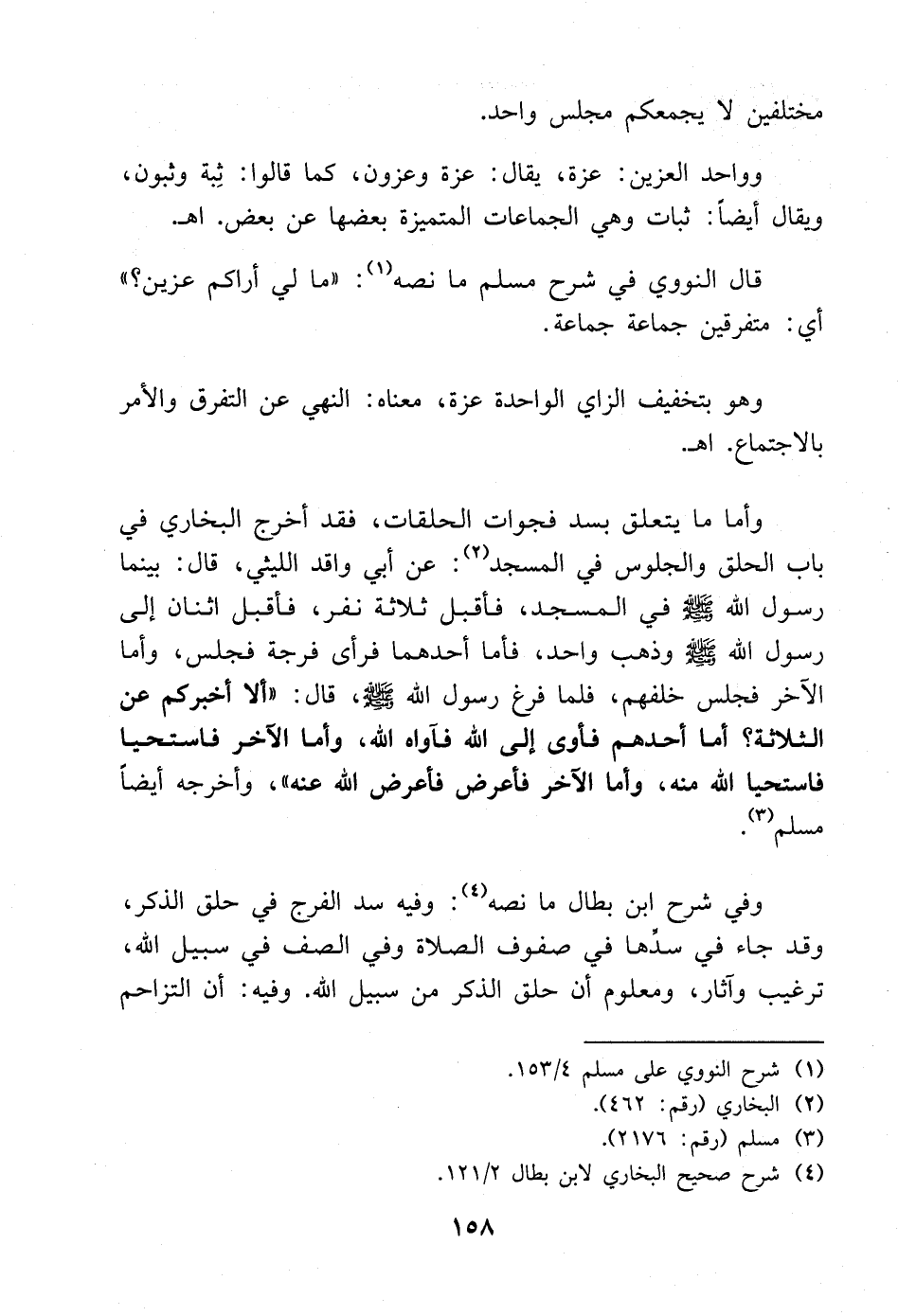 وفي شرح ابن بطال ما نصه: (¬4) وفيه سد الفرج في حلق الذكر، وقد جاء في سدِّها في صفوف الصلاة وفى الصف في سبيل الله، ترغيب وآثار، ومعلوم أن حلق الذكر من سبيل الله. وفيه: أن التزاحم