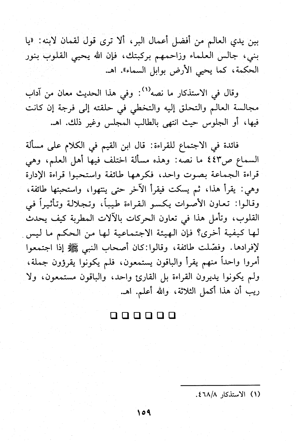بين يدي العالم من أفضل أعمال البر، ألا ترى قول لقمان لابنه: «يا بني جالس العلماء وزاحمهم بركبتك، فإن الله يحيى القلوب بنور الحكمة، كما يحيى الأرض بوابل السماء. ا. هـ.
