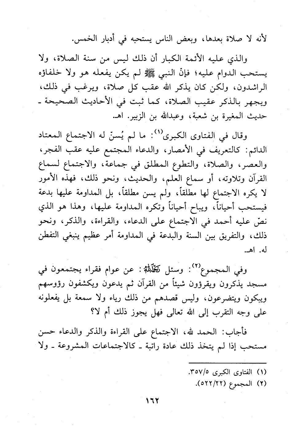 كالتعريف في الأمصار، والدعاء المجتمع عليه عقب الفجر، والعصر، والصلاة، والتطوع المطلق في جماعة، والاجتماع لسماع القرآن وتلاوته، أو سماع العلم، والحديث، ونحو ذلك، فهذه الأمور لا يكره الاجتماع لها مطلقا، ولم يسن مطلقا، بل المداومة عليها بدعة فيستحب أحيانا، ويباح أحيانا وتكره المداومة عليها، وهذا هو الذي نص عليه أحمد في الاجتماع على الدعاء، والقراءة، والذكر، ونحو ذلك، والتفريق بين السنة والبدعة في المداومة أمر عظيم ينبغي التفطن له. ا. هـ.