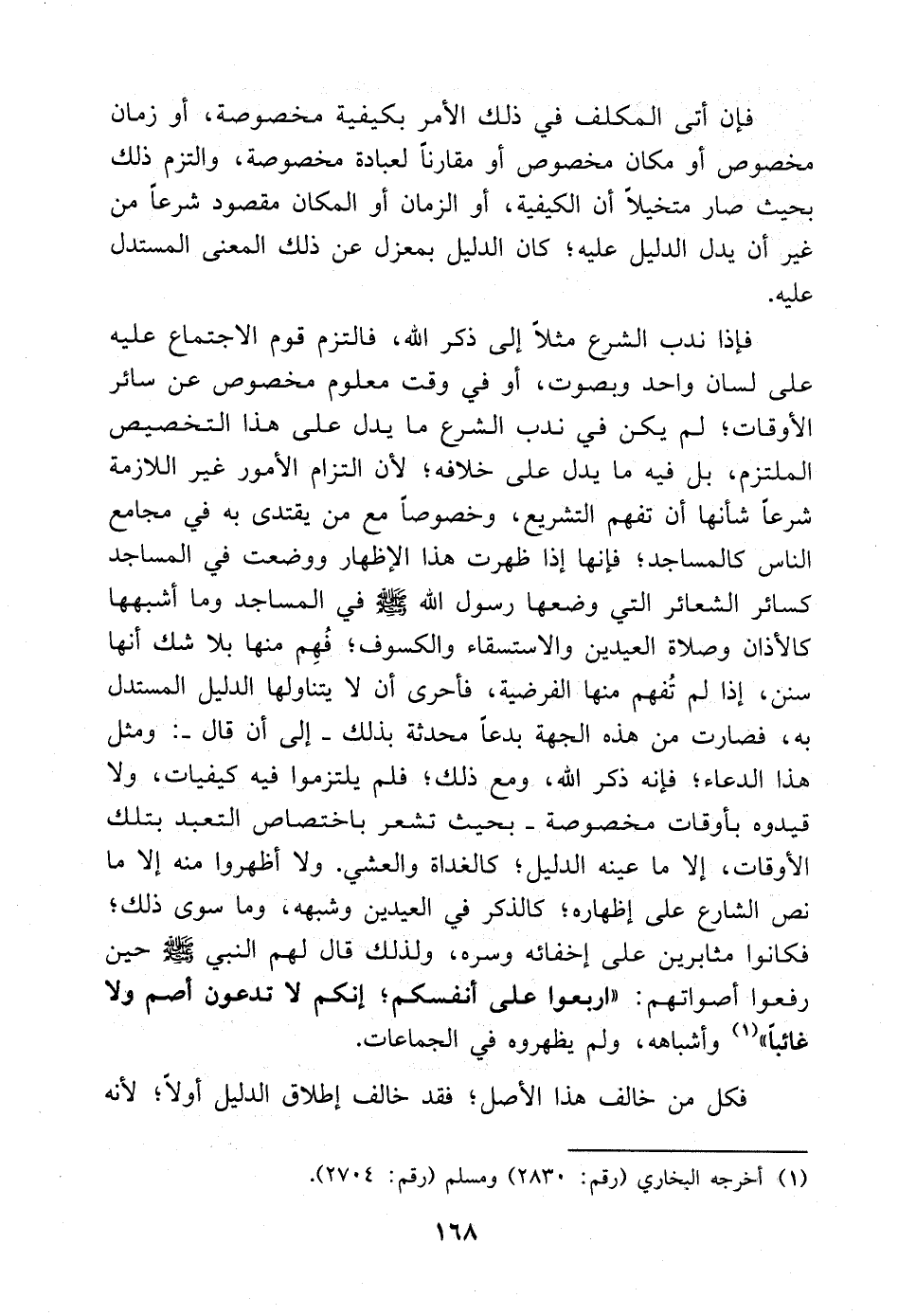 فإذا ندب الشرع مثلًا إلى ذكر الله، فالتزم قوم الاجتماع عليه على لسان واحد وبصوت، أو في وقت معلوم مخصوص عن سائر الأوقات؛ لم يكن في ندب الشرع ما يدل على هذا التخصيص الملتزم، بل فيه ما يدل على خلافه؛ لأن التزام الأمور غير اللازمة شرعًا شأنها أن تفهم التشريع، وخصوصا مع من يقتدى به في مجامع الناس كالمساجد؛ فإنها إذا ظهرت هذا الإظهار ووضعت في المساجد كسائر الشعائر التي وضعها رسول الله - صلى الله عليه وسلم - في المساجد وما أشبهها كالأذان وصلاة العيدين والاستسقاء والكسوف؛ فهم منها بلا شك أنها سنن، إذا لم تُفهم منها الفرضية، فأحرى أن لا يتناولها الدليل المستدل به، فصارت من هذه الجهة بدعًا محدثة بذلك - إلى أن قال - ومثل هذا الدعاء؛ فإنه ذكر الله، ومع ذلك؛ فلم يلتزموا فيه كيفيات، ولا قيدوه بأوقات مخصوصة. بحيث تشعر باختصاص التعبد بتلك الأوقات، إلا ما عينه الدليل؛ كالغداة والعشي. ولا أظهروا منه إلا ما نص الشارع على إظهاره؛ كالذكر في العيدين وشبهه، وما سوى ذلك؛ فكانوا مثابرين على إخفائه وسره، ولذلك قال لهم النبي - صلى الله عليه وسلم - حين رفعوا أصواتهم: «أربعوا على أنفسكم؛ إنكم لا تدعون أصم ولا غائبا» (¬1) وأشباهه، ولم يظهروه في الجماعات.