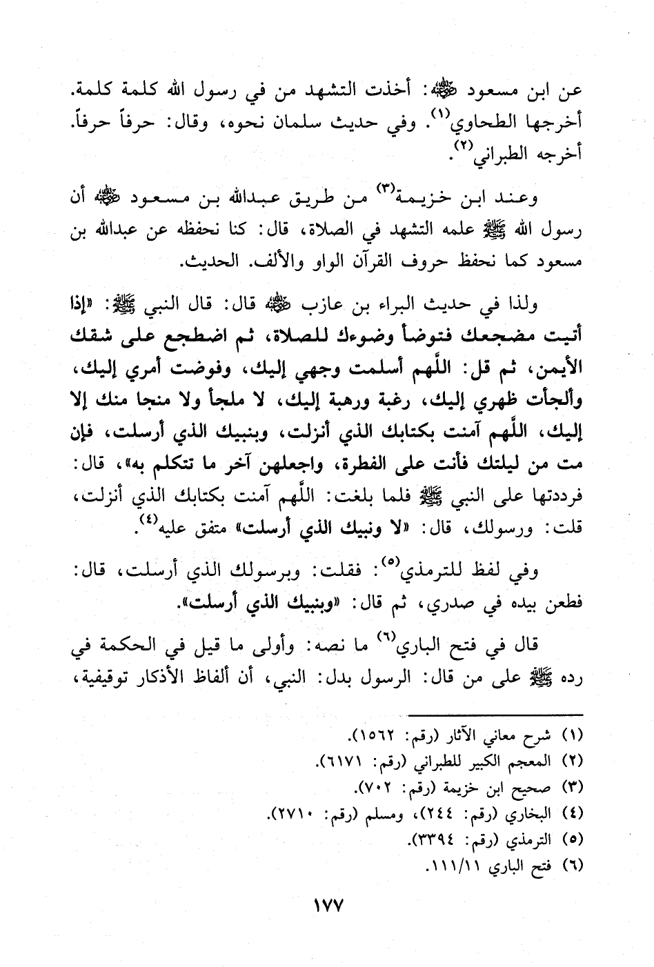 ولذا في حديث البراء بن عازب - رضي الله عنه - قال: قال النبي - صلى الله عليه وسلم -: «إذا أتيت مضجعك فتوضأ وضوءك للصلاة، ثم اضطجع على شقك الأيمن، ثم قل اللهم أسلمت وجهي إليك، وفوضت أمري إليك، وألجأت ظهري إليك، رغبة ورهبة إليك، لا ملجأ ولا منجى منك إلا إليك، اللهم آمنت بكتابك الذي أنزلت، وبنبيك الذي أرسلت، فإن مت من ليلتك فأنت على الفطرة، واجعلهن آخر ما تتكلم به» قال فرددتها على النبي - صلى الله عليه وسلم - فلما بلغت اللهم آمنت بكتابك الذي أنزلت قلت ورسولك، قال: «لا ونبيك الذي أرسلت» متفق عليه. (¬4)