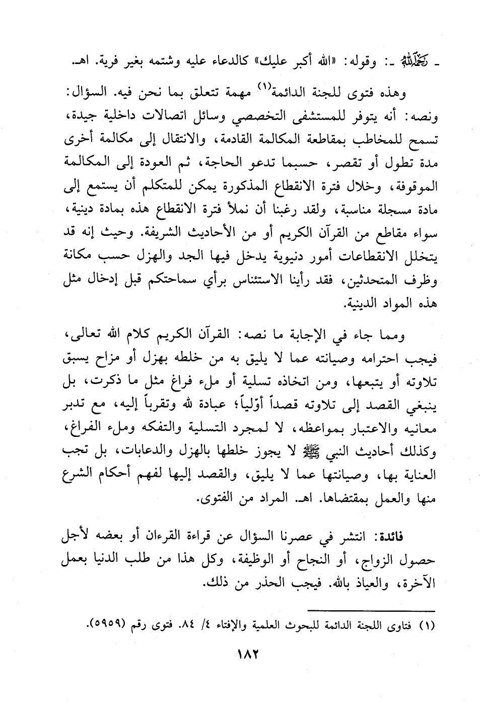وهذه فتوى للجنة الدائمة (¬1) مهمة تتعلق بما نحن فيه. السؤال: ونصه: أنه يتوفر للمستشفى التخصصي وسائل اتصالات داخلية جيدة، تسمح للمخاطب بمقاطعة المكالمة القادمة، والانتقال إلى مكالمة أخرى مدة تطول أو تقصر، حسبما تدعو الحاجة، ثم العودة إلى المكالمة الموقوفة، وخلال فترة الانقطاع المذكورة يمكن للمتكلم أن يستمع إلى مادة مسجلة مناسبة، ولقد رغبنا أن نملأ فترة الانقطاع هذه بمادة دينية، سواء مقاطع من القرآن الكريم أو من الأحاديث الشريفة. وحيث إنه قد يتخلل الانقطاعات أمور دنيوية يدخل فيها الجد والهزل حسب مكانة وظرف المتحدثين، فقد رأينا الاستئناس برأي سماحتكم قبل إدخال مثل هذه المواد الدينية.