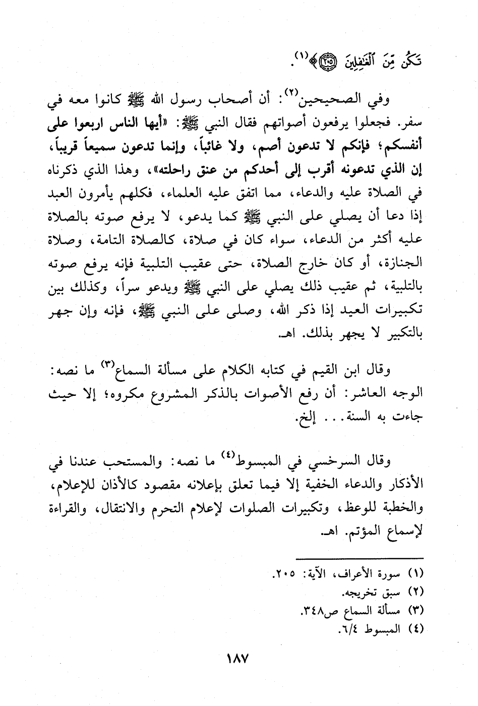 وقال ابن القيم في كتابه الكلام على مسالة السماع (¬2) ما نصه: الوجه العاشر: أن رفع الأصوات بالذكر المشروع مكروه؛ إلا حيث جاءت به السنة ... الخ.