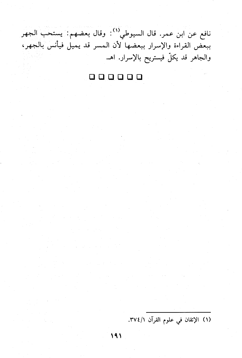 نافع عن ابن عمر. قال السيوطي: (¬1) وقال بعضهم يستحب الجهر ببعض القراءة والأسرار ببعضها لأن المسر قد يميل فيأنس بالجهر والجاهر قد يكل فيستريح بالإسرار ا. هـ.