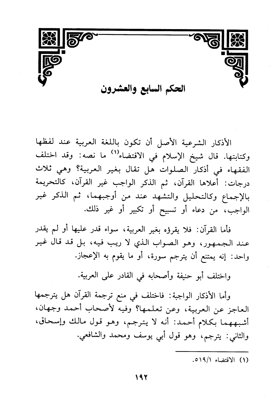 وأما الأذكار الواجبة: فاختلف في منع ترجمة القرآن هل يترجمها العاجز عن العربية، وعن تعلمها؟ وفيه لأصحاب أحمد وجهان، أشبهها بكلام أحمد: أنه لا يترجم، وهو قول مالك وإسحاق، والثاني: يترجم، وهو قول أبي يوسف ومحمد والشافعي.