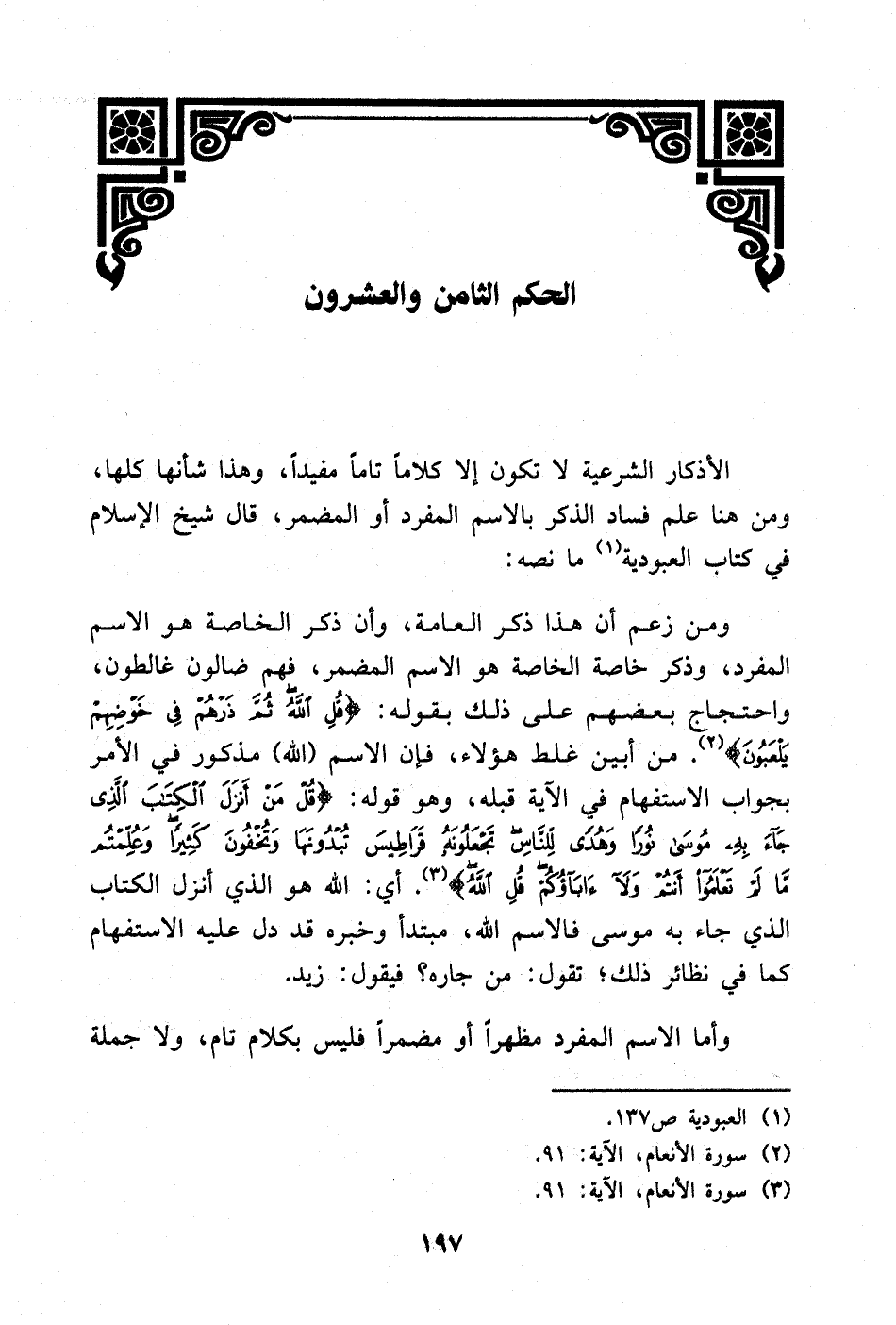 الأذكار الشرعية لا تكون إلا كلاما تامًا مفيدًا، وهذا شأنها كلها، ومن هنا علم فساد الذكر بالاسم المفرد أو المضمر، قال شيخ الإسلام في كتاب العبودية (¬1) ما نصه: