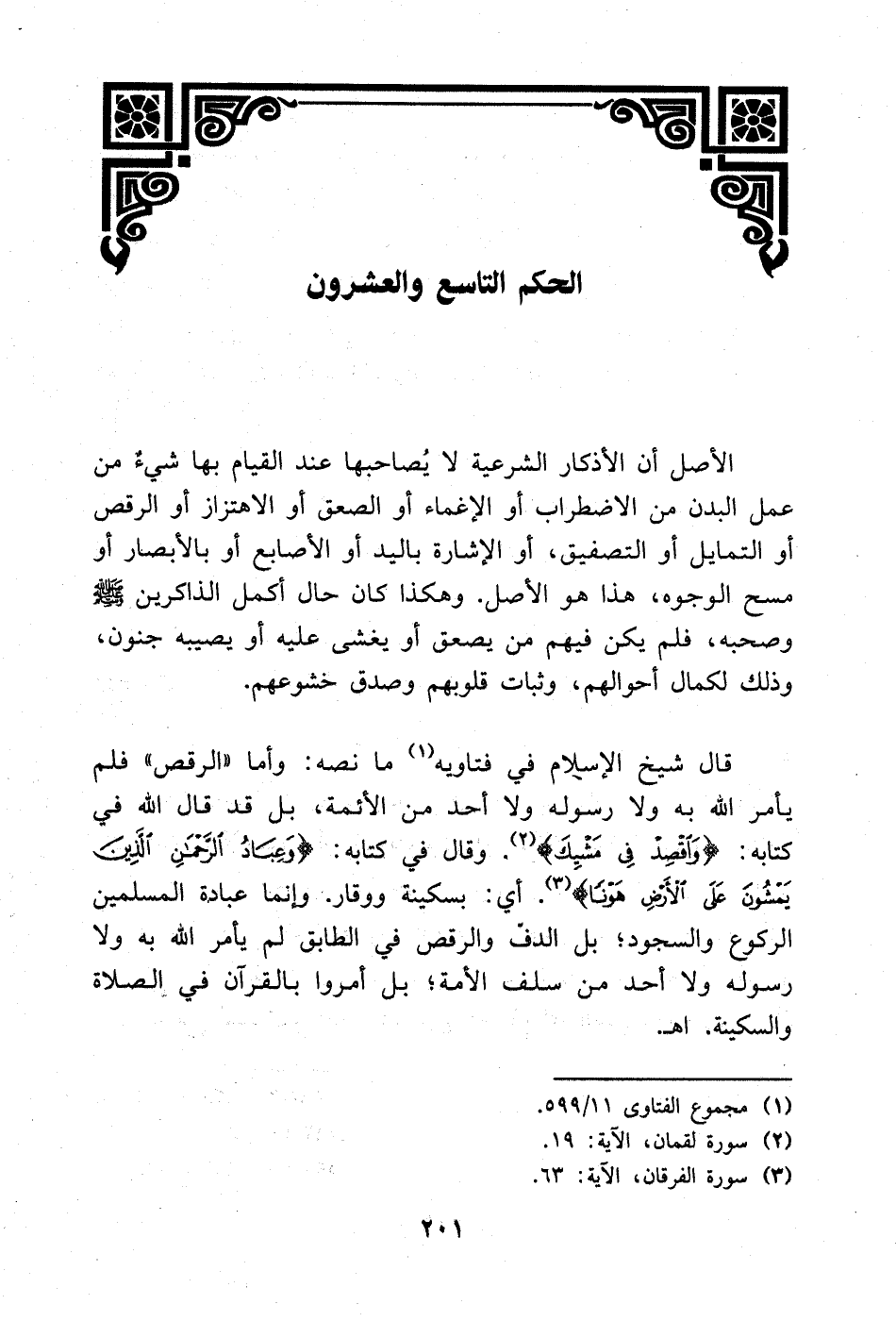 قال شيخ الإسلام في فتاويه (¬1) ما نصه: وأما «الرقص» فلم يأمر الله به ولا رسوله ولا أحد من الأئمة، بل قد قال الله في كتابه: {وَاقْصِدْ فِي مَشْيِكَ} [لقمان: 19]. وقال في كتابه: {وَعِبَادُ الرَّحْمَنِ الَّذِينَ يَمْشُونَ عَلَى الْأَرْضِ هَوْنًا} [الفرقان: 63]. أي: بسكينة ووقار. وإنما عبادة المسلمين الركوع والسجود؛ بل الدف والرقص في الطابق لم يأمر الله به ولا رسوله ولا أحد من سلف الأمة؛ بل أمروا بالقرآن في الصلاة والسكينة. ا. هـ.