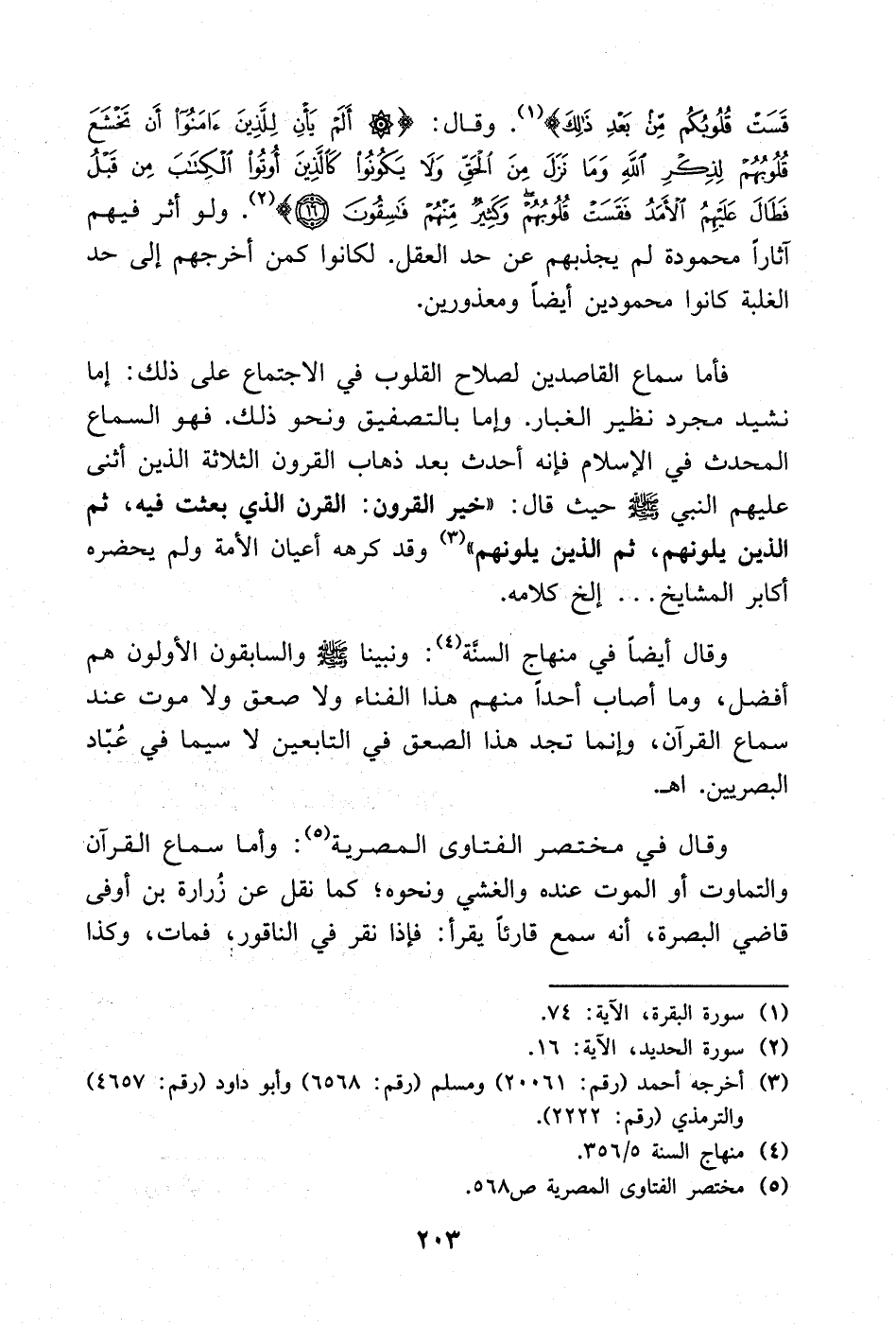 وقال في مختصر الفتاوى المصرية: (¬3) وأما سماع القرآن والتماوت أو الموت عنده والغشي ونحوه؛ كما نقل عن زُرارة بن أوفى قاضي البصرة، أنه سمع قارئًا يقرأ فإذا نقر في الناقور فمات، وكذا