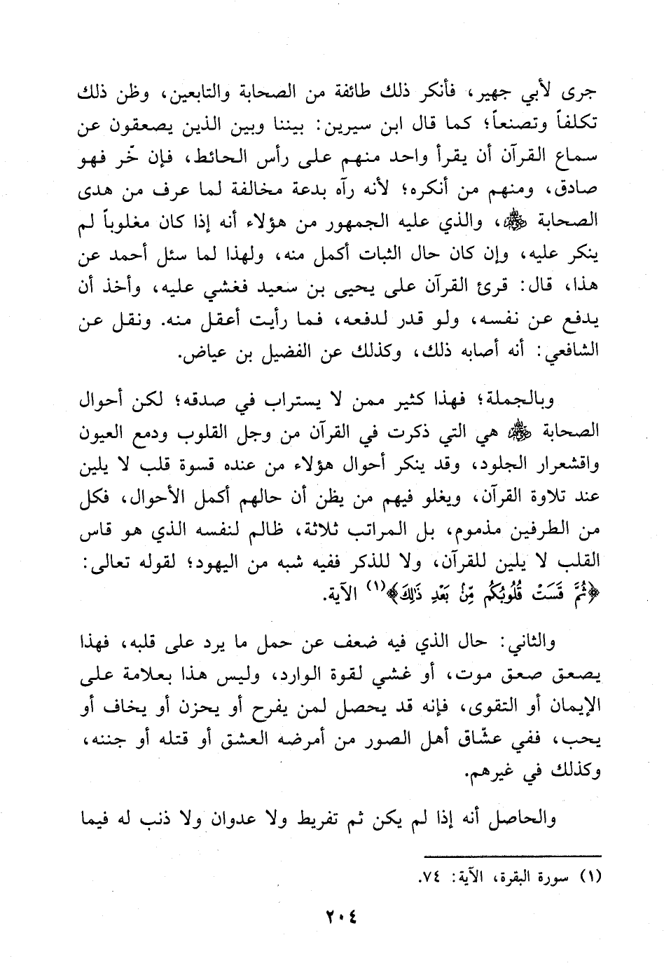 ونقل عن الشافعي: أنه أصابه ذلك، وكذلك عن الفضيل بن عياض. وبالجملة فهذا كثير ممن لا يستراب في صدقه؛ لكن أحوال الصحابة ? هي التي ذكرت في القرآن من وجل القلوب ودمع العيون واقشعرار الجلود، وقد ينكر أحوال هؤلاء من عنده قسوة قلب لا يلين عند تلاوة القرآن، ويغلو فيهم من يظن أن حالهم أكمل الأحوال، فكل من الطرفين مذموم، بل المراتب ثلاثة، ظالم لنفسه الذي هو قاس القلب لا يلين للقرآن، ولا للذكر ففيه شبه من اليهود لقوله تعالى: {ثُمَّ قَسَتْ قُلُوبُكُمْ مِنْ بَعْدِ ذَلِكَ} [البقرة: 74]. الآية.