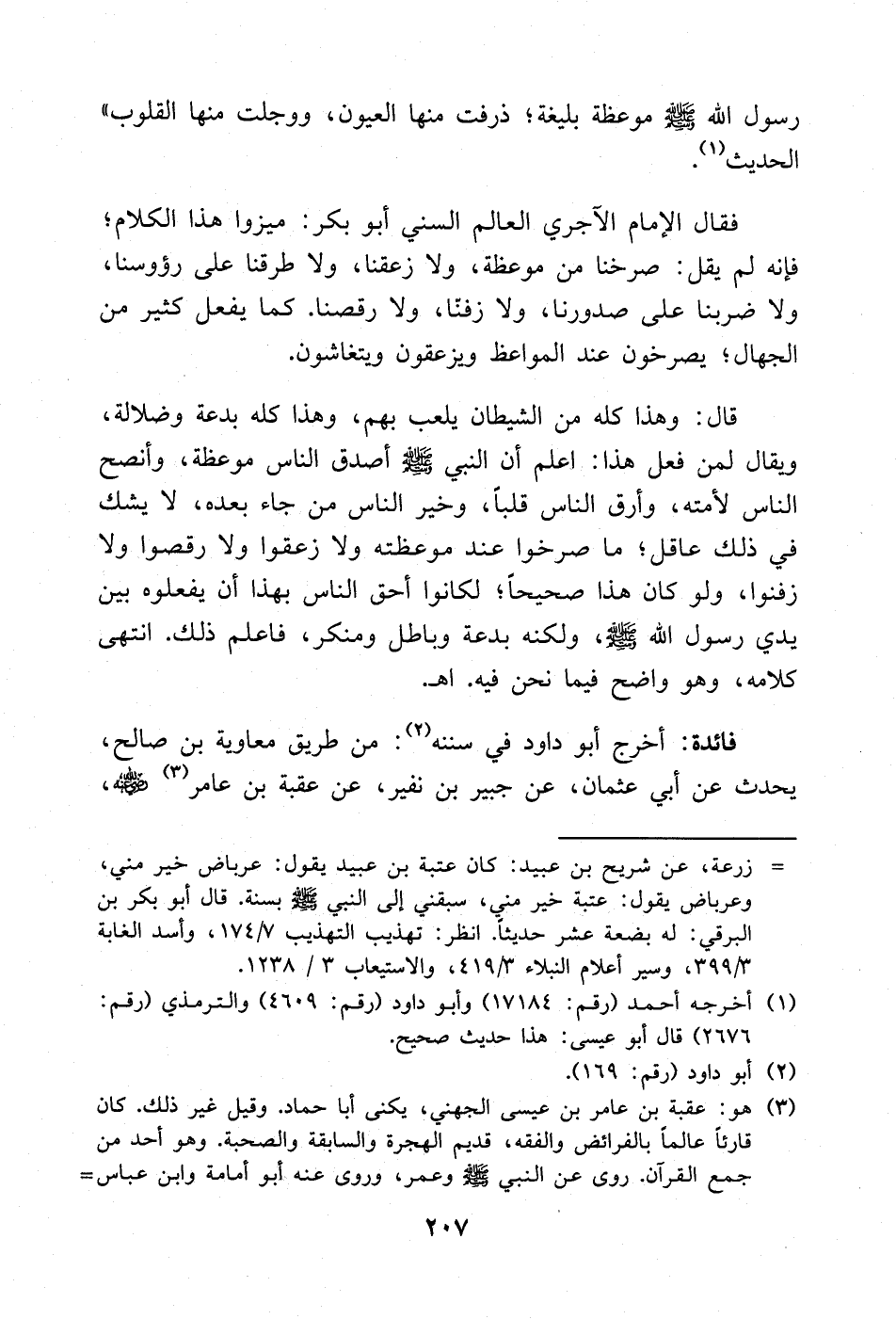 فقال الإمام الآجري العالم السني أبو بكر: ميزوا هذا الكلام؛ فإنه لم يقل: صرخنا من موعظة، ولا زعقنا، ولا طرقنا على رؤوسنا، ولا ضربنا على صدورنا، ولا زفنّا، ولا رقصنا. كما يفعل كثير من الجهال؛ يصرخون عند المواعظ ويزعقون ويتغاشون.