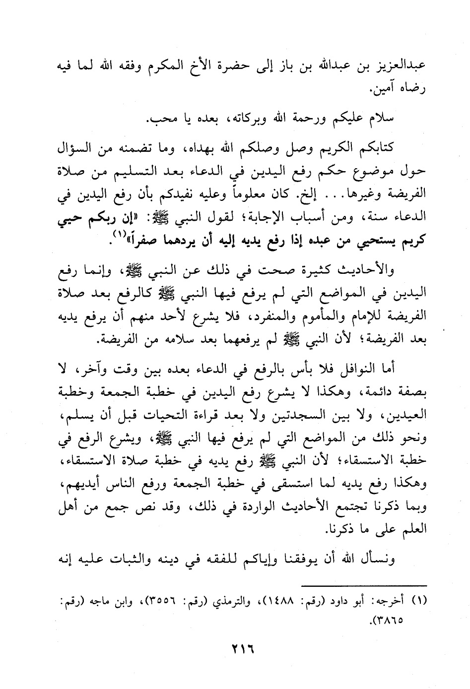 كتابكم الكريم وصل وصلكم الله بهداه، وما تضمنه من السؤال حول موضوع حكم رفع اليدين في الدعاء بعد التسليم من صلاة الفريضة وغيرها.