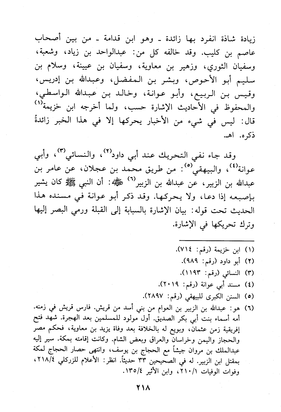 وقد جاء نفي التحريك عند أبي داود (¬2)، والنسائي (¬3)، وأبو عوانة (¬4)، والبيهقي (¬5): من طريق محمد بن عجلان، عن عامر بن عبد الله بن الزبير، عن عبد الله بن الزبير (¬6) - رضي الله عنه -: أن النبي - صلى الله عليه وسلم - كان يشير بإصبعه إذا دعا، ولا يحركها. وقد ذكر أبو عوانة في مسنده هذا الحديث تحت قوله: بيان الإشارة بالسبابة إلى القبلة ورمي البصر إليها وترك تحريكها في الإشارة.