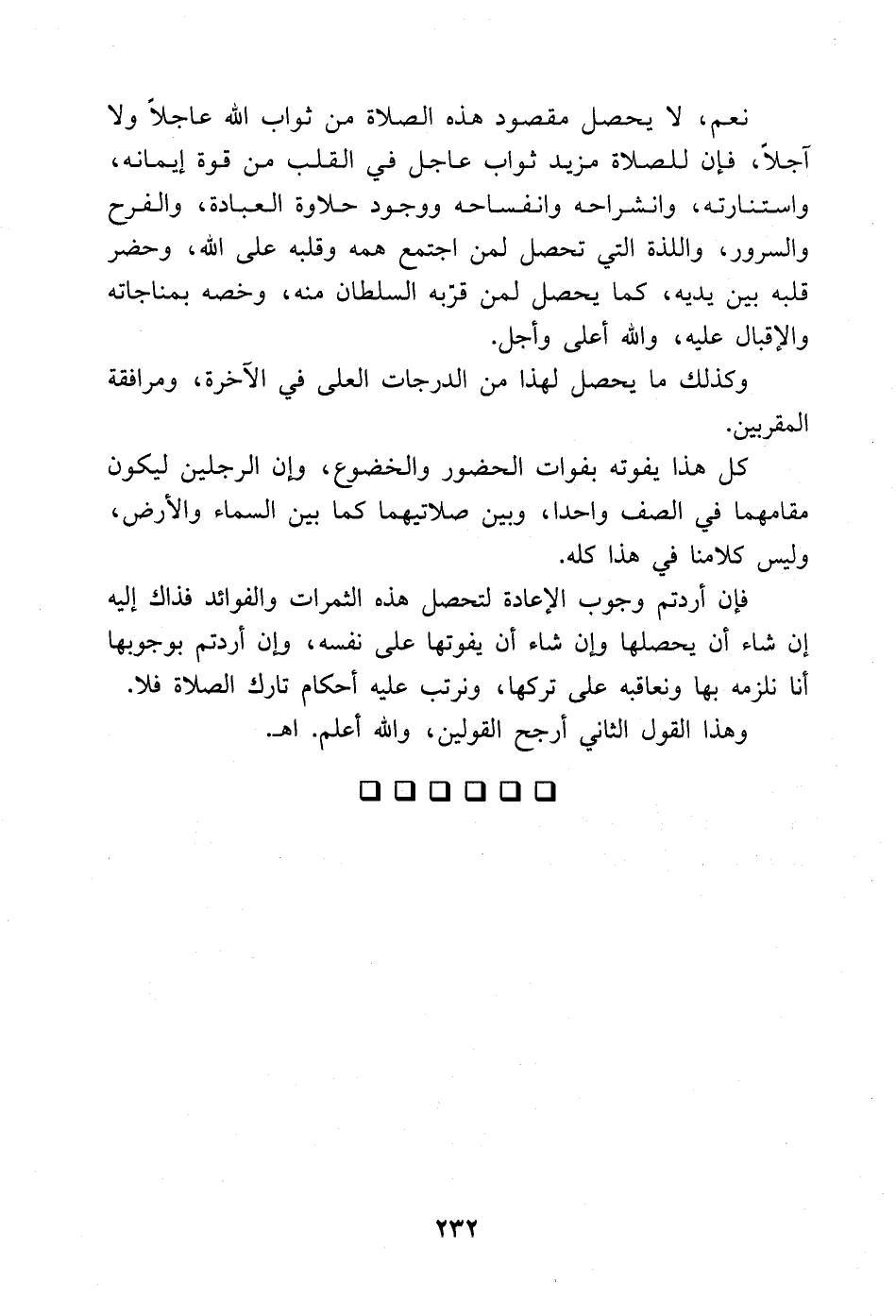 كل هذا يفوته بفوات الحضور والخضوع، وإن الرجلين ليكون مقامهما في الصف واحدا، وبين صلاتيهما كما بين السماء والأرض، وليس كلامنا في هذا كله.