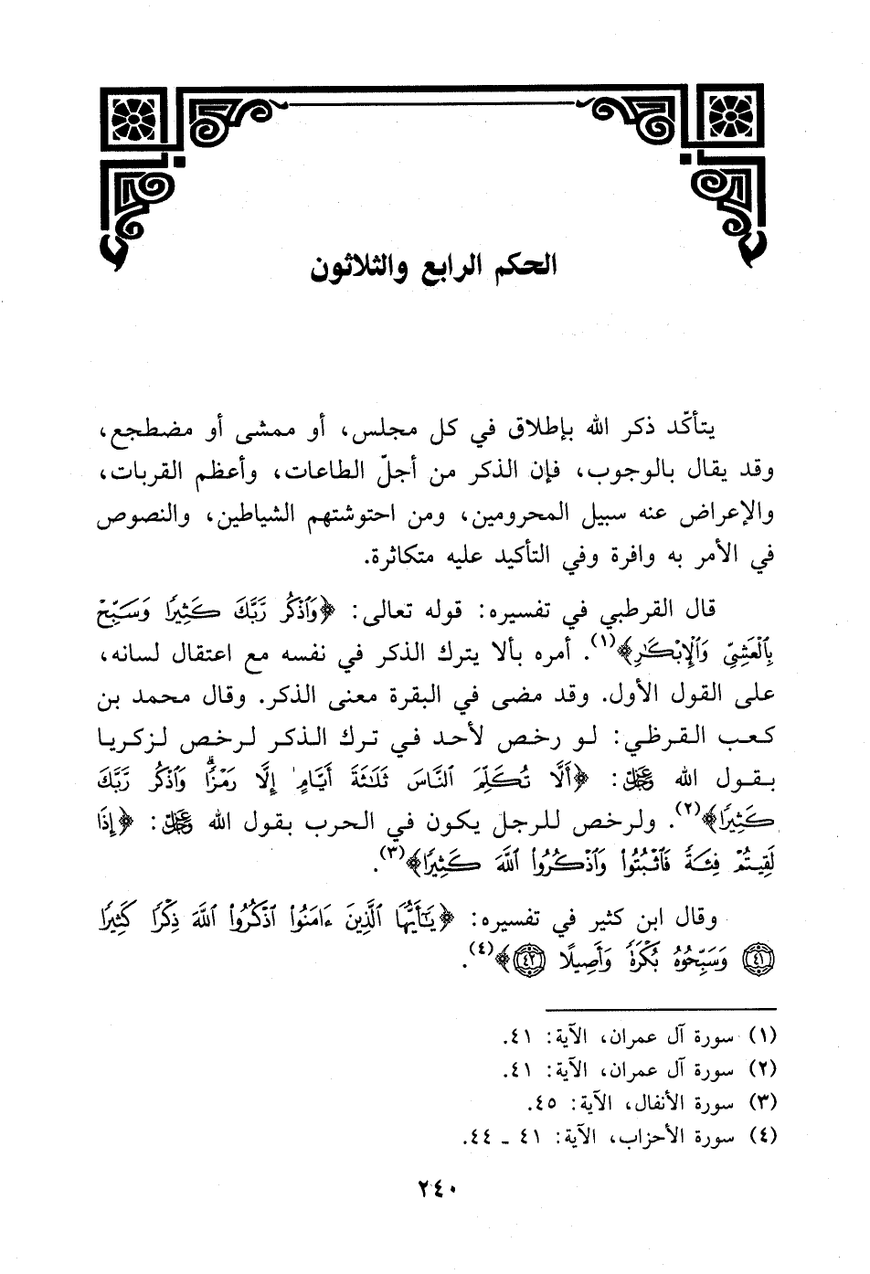 قال القرطبي في تفسيره: قوله تعالى: {وَاذْكُرْ رَبَّكَ كَثِيرًا وَسَبِّحْ بِالْعَشِيِّ وَالْإِبْكَارِ} [آل عمران: 41]. أمره بألا يترك، الذكر في نفسه مع اعتقال لسانه، على القول الأول. وقد مضى في البقرة معنى الذكر. وقال محمد ابن كعب القرظي: لو رخص لأحد في ترك الذكر لرخص لزكريا بقول الله - عز وجل -: {أَلَّا تُكَلِّمَ النَّاسَ ثَلَاثَةَ أَيَّامٍ إِلَّا رَمْزًا وَاذْكُرْ رَبَّكَ كَثِيرًا} [آل عمران: 41]. ولرخص للرجل يكون في الحرب بقول الله - عز وجل -: {إِذَا لَقِيتُمْ فِئَةً فَاثْبُتُوا وَاذْكُرُوا اللَّهَ كَثِيرًا} [الأنفال: 45].