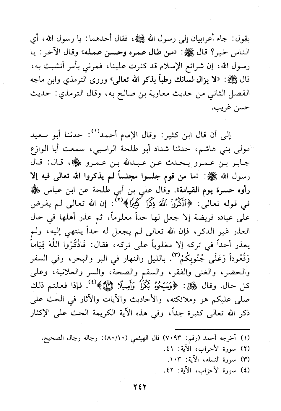 إلى أن قال ابن كثير: وقال الإمام أحمد: (¬1) حدثنا أبو سعيد مولى بني هاشم، حدثنا شداد أبو طلحة الراسبي، سمعت أبا الوازع جابر بن عمرو يحدث عن عبد الله بن عمرو - رضي الله عنه -، قال: قال رسول الله - صلى الله عليه وسلم -: «ما من قوم جلسوا مجلسا لم يذكروا الله تعالى فيه إلا رأوه حسرة يوم القيامة». وقال علي بن أبي طلحة عن ابن عباس - رضي الله عنه - في قوله تعالى: {اذْكُرُوا اللَّهَ ذِكْرًا كَثِيرًا} [الأحزاب: 41]. إن الله تعالى لم يفرض على عباده فريضة إلا جعل لها حدا معلومًا، ثم عذر أهلها في حال العذر غير الذكر، فإن الله تعالى لم يجعل له حدًا ينتهي إليه، ولم يعذر أحدًا في تركه إلا مغلوبًا على تركه، فقال: {فَاذْكُرُوا اللَّهَ قِيَامًا وَقُعُودًا وَعَلَى جُنُوبِكُمْ} [النساء: 103]. بالليل والنهار في البر والبحر، وفي السفر والحضر، والغنى والفقر، والسقم والصحة، والسر والعلانية، وعلى كل حال. وقال - عز وجل -: {وَسَبِّحُوهُ بُكْرَةً وَأَصِيلًا} [الأحزاب: 42]. فإذا فعلتم ذلك صلى عليكم هو وملائكته، والأحاديث والآيات والآثار في الحث على ذكر الله تعالى كثيرة جدا، وفي هذه الآية الكريمة الحث على الإكثار