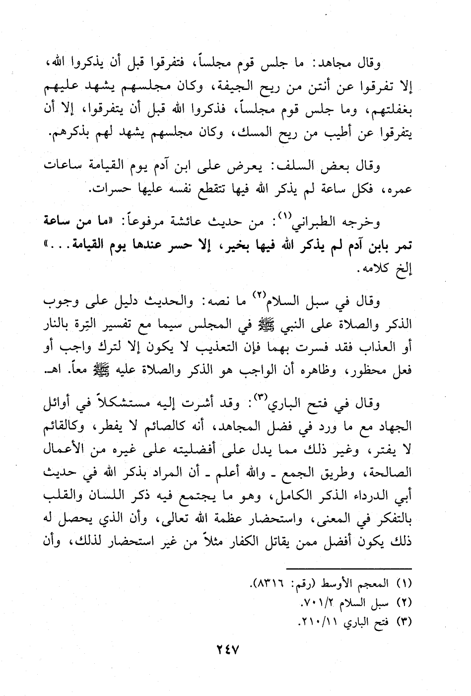 وقال في سبل السلام (¬2) ما نصه: والحديث دليل على وجوب الذكر والصلاة على النبي - صلى الله عليه وسلم - في المجلس سيما مع تفسير الترة بالنار أو العذاب فقد فسرت بهما فإن التعذيب لا يكون إلا لترك واجب أو فعل محظور، وظاهره أن الواجب هو الذكر والصلاة عليه - صلى الله عليه وسلم - معًا. ا. هـ.