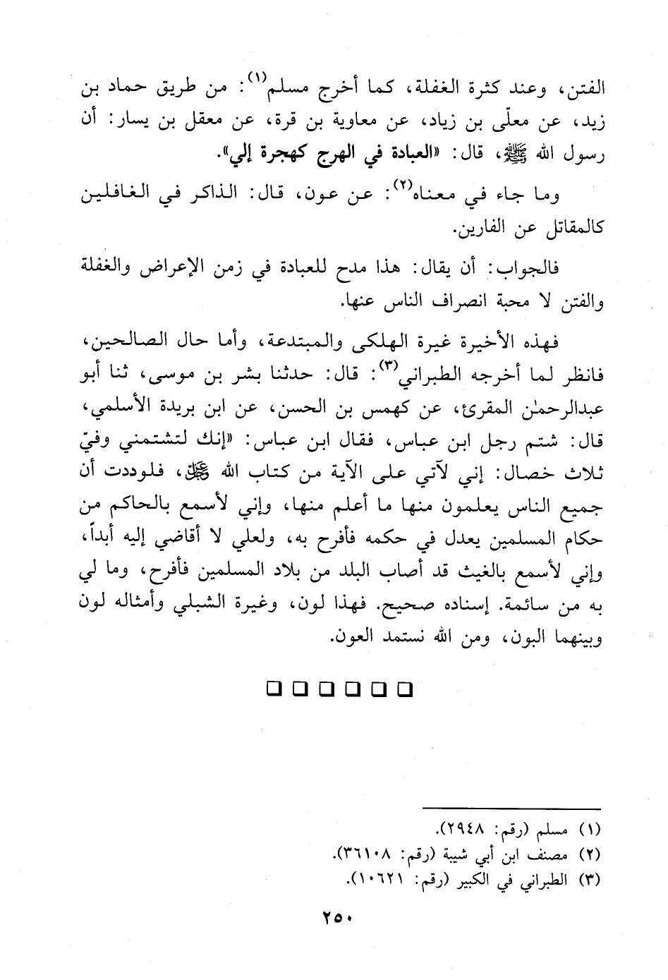 الفتن، وعند كثرة الغفلة، كم أخرج مسلم: (¬1) من طريق حماد بن زيد، عن معلّى بن زياد، عن معاوية بن قرة، عن معقل بن يسار: أن رسول الله - صلى الله عليه وسلم -، قال: «العبادة في الهرج كهجرة إلي».