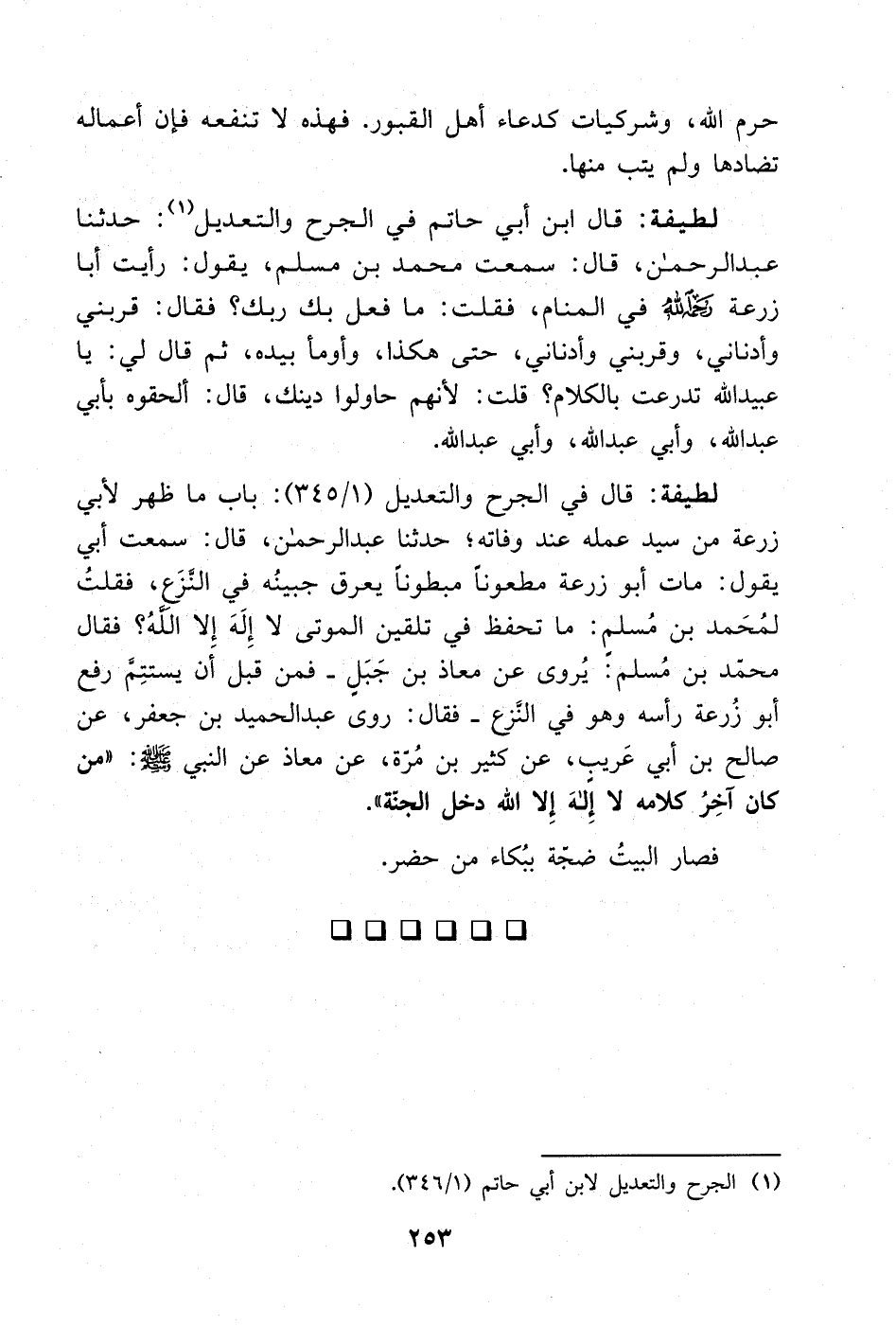 لطيفة: قال ابن أبي حاتم في الجرح والتعديل: (¬1) حدثنا عبد الرحمن، قال: سمعت محمد بن مسلم، يقول: رأيت أبا زرعه - رحمه الله - في المنام، فقلت: ما فعل بك ربك؟ فقال: قربني وأدناني، وقربني وأدناني، حتى هكذا، وأومأ بيده، ثم قال لي: يا عبيد الله تدرعت بالكلام؟ قلت: لأنهم حاولوا دينك، قال: ألحقوه بأبي عبد الله، وأبي عبد الله، وأبي عبد الله. لطيفة: قال في الجرح والتعديل (1/ 345): باب ما ظهر لأبي زرعه من سيد عمله عند وفاته حدثنا عبد الرحمن قال سمعت أبي يقول: مات أبو زرعه مطعونًا مبطونًا يعرق جبينه في الَنَزّعِ فقلتُ لمحَمد بن مُسلمٍ: ما تحفظ في تلقين الموتى لا إلهَ إلا الله؟ فقال محمد بن مُسلم: يُروى عن معاذ بن جَبلٍ - فمن قبل أن يستتمَّ رفع أبو زرعه رأسه وهو في النَّزع فقال: روى عبد الحميد بن جعفر عن صالح بن أبي عَريبٍ عن كثير بن مُرة عن معاذ عن النبي - صلى الله عليه وسلم -: من كان آخِرُ كلامه لا إلهَ إلا الله دخل الجنة.