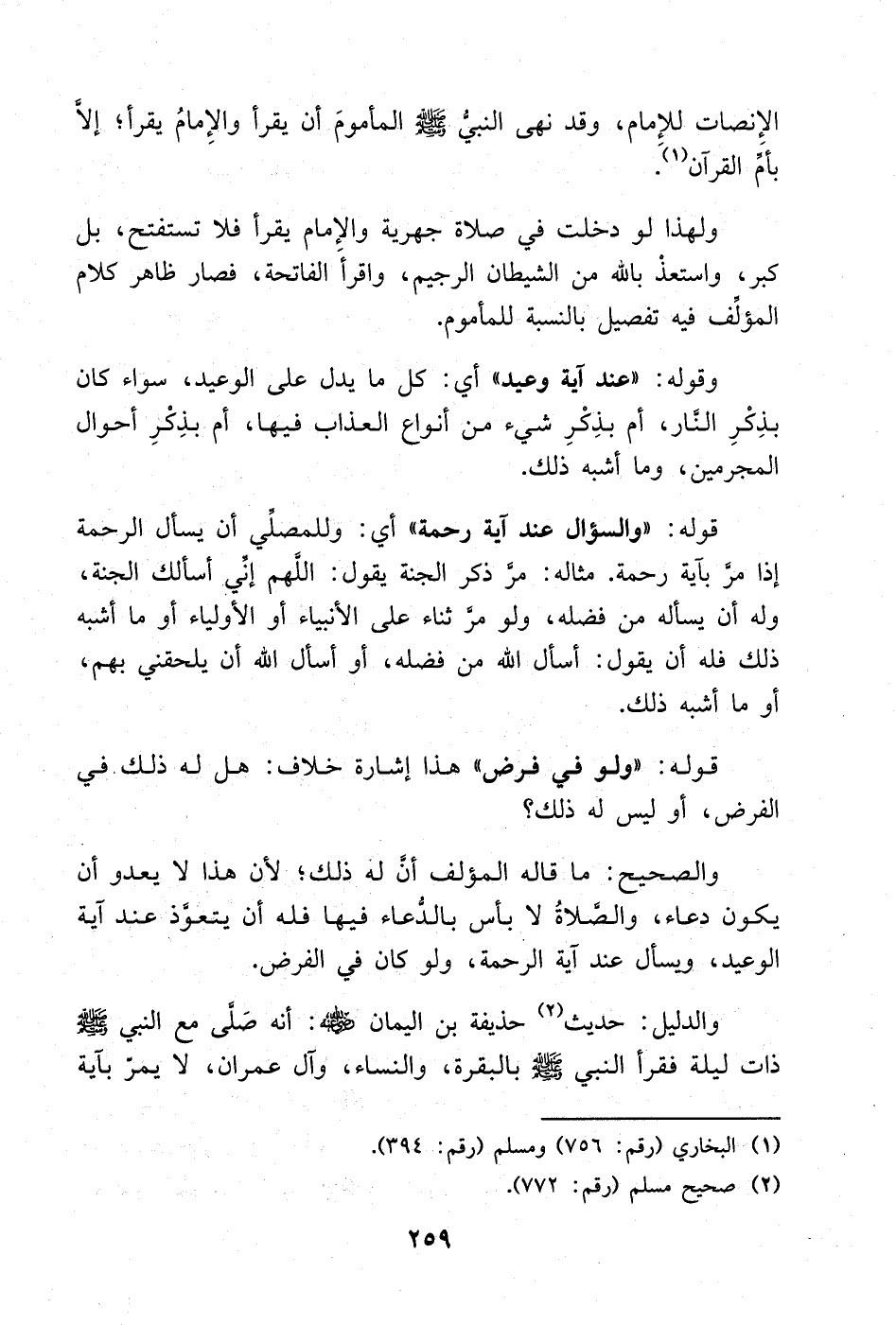 والدليل: حديث (¬2) حذيفة بن اليمان - رضي الله عنه -: أنه صَلَّى مع النبي صلّى - صلى الله عليه وسلم - ذات ليلة فقرأ النبي - صلى الله عليه وسلم - بالبقرة، والنساء، وآل عمران، لا يمرّ بآية