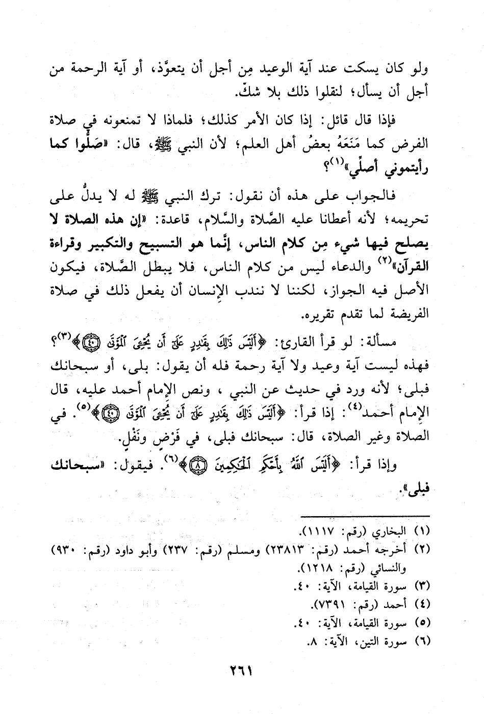 مسألة: لو قرأ القارئ: {أَلَيْسَ ذَلِكَ بِقَادِرٍ عَلَى أَنْ يُحْيِيَ الْمَوْتَى} [القيامة: 40]؟ فهذه ليست آية وعيد ولا آية رحمة فله أن يقول: بلى، أو سبحانك فبلى؛ لأنه ورد في حديث عن النبي عليه الصلاة والسلام، ونص الإمام أحمد عليه، قال الإمام أحمد: (¬3) إذا قرأ: {أَلَيْسَ ذَلِكَ بِقَادِرٍ عَلَى أَنْ يُحْيِيَ الْمَوْتَى} [القيامة: 40] في الصلاة وغير الصلاة، قال: سبحانك فبلى، في فَرْضٍ ونفْلٍ.