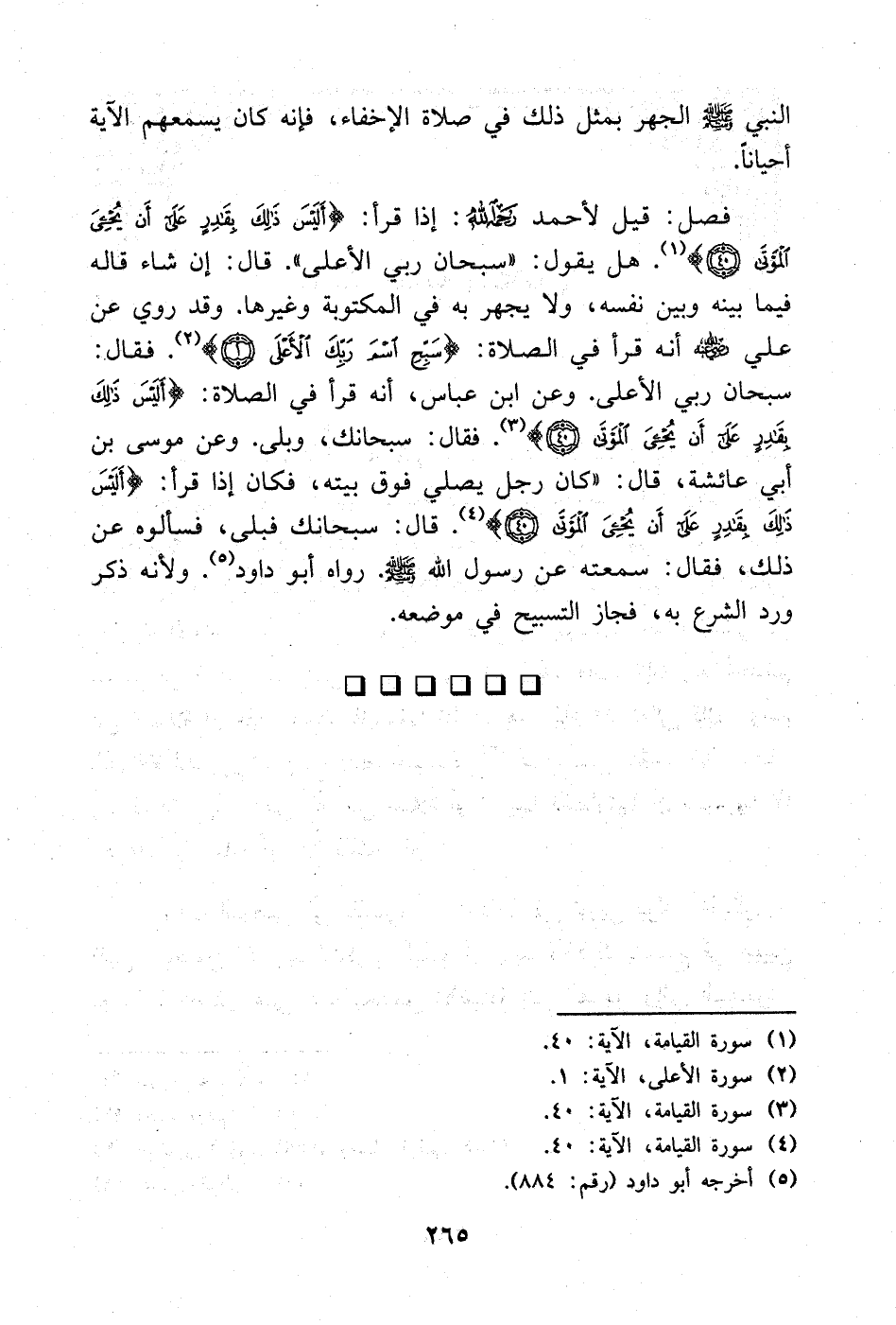 فصل: قيل لأحمد - رحمه الله -: إذا قرأ: {أَلَيْسَ ذَلِكَ بِقَادِرٍ عَلَى أَنْ يُحْيِيَ الْمَوْتَى} [القيامة: 40]. هل يقول: «سبحان ربي الأعلى». قال: إن شاء قاله فيما بينه وبين نفسه، ولا يجهر به في المكتوبة وغيرها. وقد روي عن علي - رضي الله عنه - أنه قرأ في الصلاة: {سَبِّحِ اسْمَ رَبِّكَ الْأَعْلَى} [الأعلى: 1]. فقال: سبحان ربي الأعلى،. وعن ابن عباس، أنه قرأ في الصلاة: {أَلَيْسَ ذَلِكَ بِقَادِرٍ عَلَى أَنْ يُحْيِيَ الْمَوْتَى} [القيامة: 40]، فقال: سبحانك، وبلى. وعن موسى بن أبي عائشة، قال: «كان رجل يصلي فوق بيته، فكان إذا قرأ: {أَلَيْسَ ذَلِكَ بِقَادِرٍ عَلَى أَنْ يُحْيِيَ الْمَوْتَى} [القيامة: 40]، قال: سبحانك فبكى، فسألوه عن ذلك، فقال: سمعته عن رسول الله - صلى الله عليه وسلم -. رواه أبو داود. (¬1) ولأنه ذكر ورد الشرع به، فجاز التسبيح في موضعه.