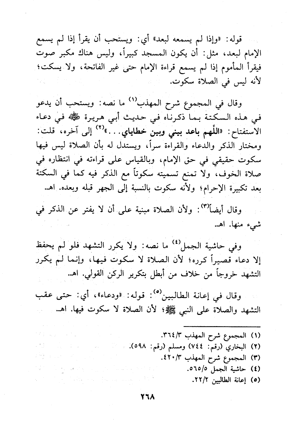 وقال في المجموع شرح المهذب (¬1) ما نصه: ويستحب أن يدعو في هذه السكتة بما ذكرناه في حديث أبي هريرة - رضي الله عنه - في دعاء الاستفتاح: «اللهم باعد بيني وبين خطاياي إلى آخره» (¬2) قلت: ومختار الذكر والدعاء والقراءة سرًا، ويستدل له بأن الصلاة ليس فيها سكوت حقيقي في حق الإمام، بالقياس على قراءته في انتظاره في صلاة الخوف، ولا تمنع تسميته سكوتًا مع الذكر فيه كما في السكتة بعد تكبيرة الإحرام؛ ولأنه سكوت بالنسبة إلى الجهر قبله وبعده. ا. هـ.