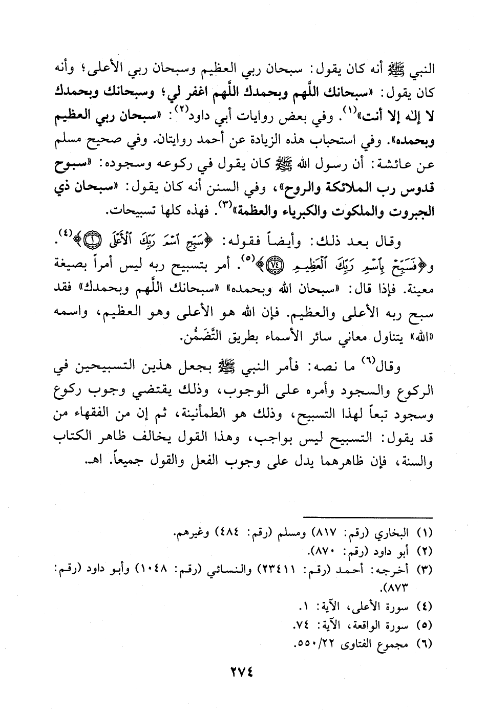 وقال: (¬4) ما نصه: فأمر النبي - صلى الله عليه وسلم - بجعل هذين التسبيحين في الركوع والسجود وأمره على الوجوب، وذلك يقتضي وجوب ركوع وسجود تبعًا لهذا التسبيح، وذلك هو الطمأنينة، ثم إن من الفقهاء من قد يقول: التسبيح ليس بواجب، وهذا القول يخالف ظاهر الكتاب والسنة، فإن ظاهرهما يدل على وجوب الفعل والقول جميعًا. ا. هـ.
