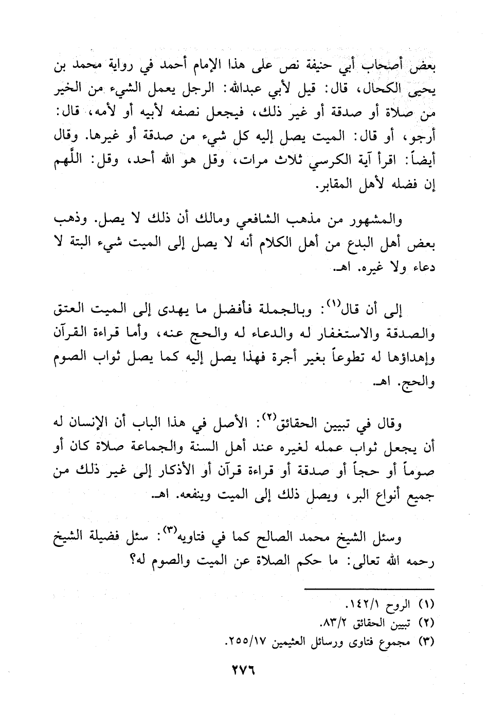 بعض أصحاب أبي حنيفة نص على هذا الإمام أحمد في رواية محمد بن يحيى الكحال، قال: قيل لأبي عبد الله الرجل يعمل الشيء من الخير من صلاة أو صدقة أو غير ذلك، فيجعل نصفه لأبيه أو لأمه، قال: أرجو أو قال الميت يصل إليه كل شيء من صدقة أو غيرها. وقال أيضًا: اقرأ آية الكرسي ثلاث مرات، وقل هو الله أحد، وقل اللهم إن فضله لأهل المقابر.