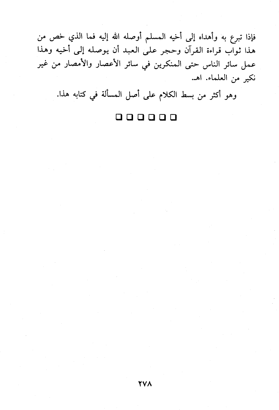 فإذا تبرع به وأهداه إلى أخيه المسلم أوصله الله إليه فما الذي خص من هذا ثواب قراءة القرآن وحار على العبد أن يوصله إلى أخيه وهذا عمل سائر الناس حتى المنكرين في سائر الإعصار والأمصار من غير نكير من العلماء. ا. هـ.