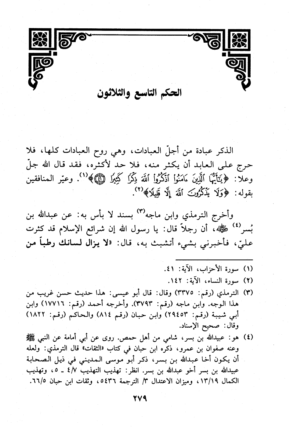 وأخرج الترمذي وابن ماجه (¬1) بسند لا بأس به: عن عبد الله بن بُسر (¬2) - رضي الله عنه -، أن رجلًا قال: يا رسول الله إن شرائع الإسلام قد كثرت عليّ، فأخبرني بشيء أتشبث به، قال: «لا يزال لسانك رطبًا من