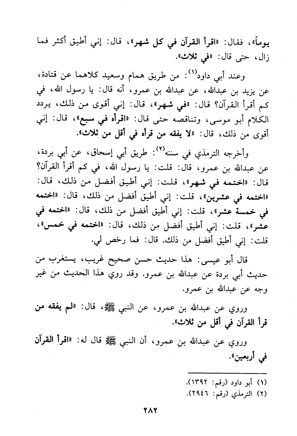 يومًا» فقال: «اقرأ القرآن في كل شهر»، قال: إني أطيق أكثر فما زال، حتى قال: «في ثلاث».