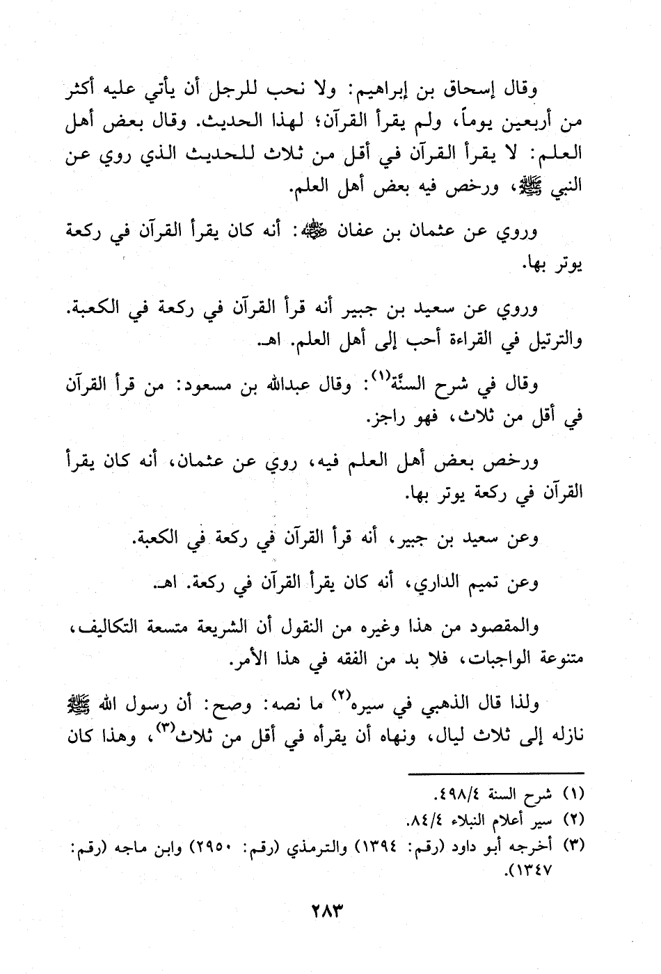 وقال إسحاق بن إبراهيم: ولا نحب للرجل أن يأتي عليه أكثر من أربعين يوما، ولم يقرأ القرآن لهذا الحديث. وقال: بعض أهل العلم لا يقرأ القرآن في أقل من ثلاث للحديث الذي روي عن النبي - صلى الله عليه وسلم -، ورخص فيه بعض أهل العلم.