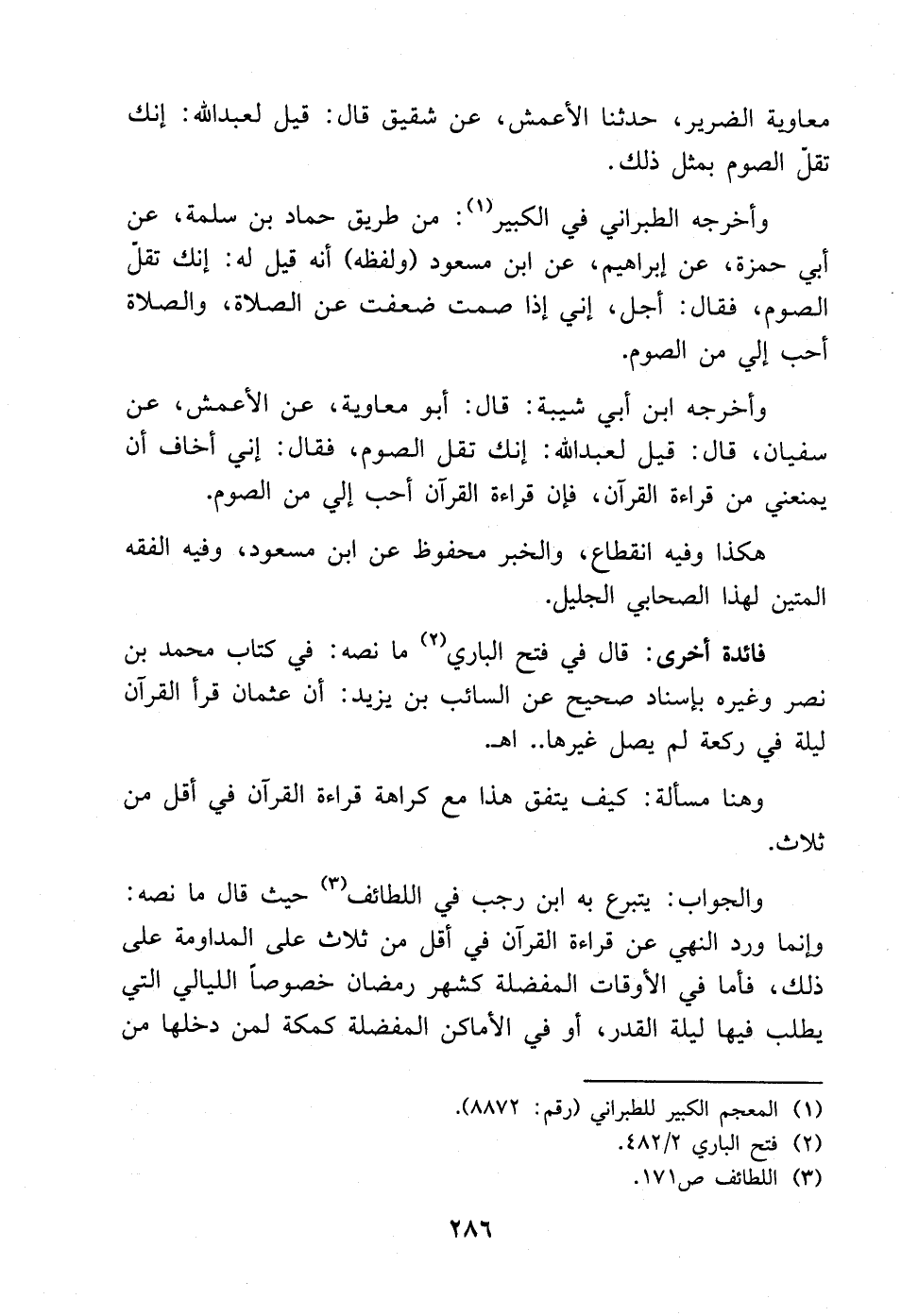 وأخرجه ابن أبي شيبة: قال: أبو معاوية، عن الأعمش، عن سفيان، قال: قيل لعبد الله: إنك تقل الصوم، فقال: إني أخاف أن يمنعني من قراءة القرآن، فإن قراءة القرآن أحب إلي من الصوم.
