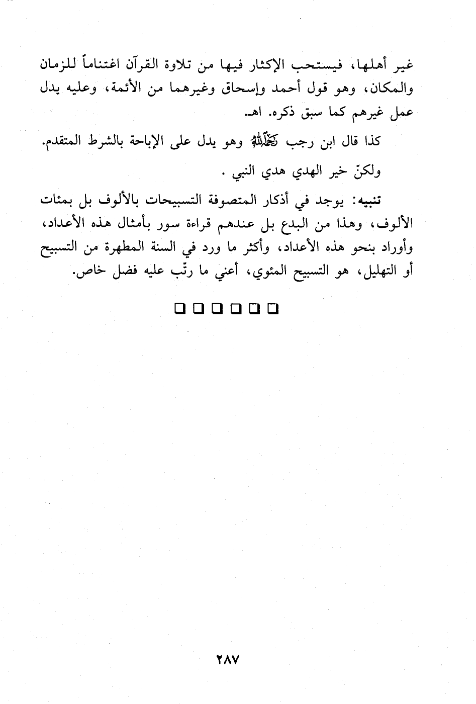 تنبيه: يوجد في أذكار المتصوفة التسبيحات بالألوف بل بمئات الألوف، وهذا من البدع بل عندهم قراءة سور بأمثال هذه الأعداد، وأوراد بنحو هذه الأعداد، وأكثر ما ورد في السنة المطهرة من التسبيح أو التهليل، هو التسبيح المئوي، أعني ما رتّب عليه فضل خاص.