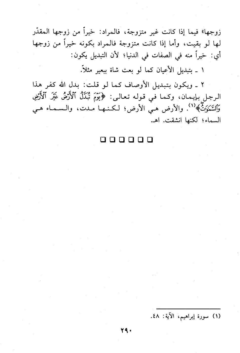 2 - ويكون بتبديل الأوصاف كما لو قلت: بدل الله كفر هذا الرجل بإيمان، وكما في قوله تعالى: {يَوْمَ تُبَدَّلُ الْأَرْضُ غَيْرَ الْأَرْضِ وَالسَّمَاوَاتُ} [إبراهيم: 42]. والأرض هي الأرض؛ لكنها مدت، والسماء هي السماء؛ لكنها انشقت. ا. هـ.