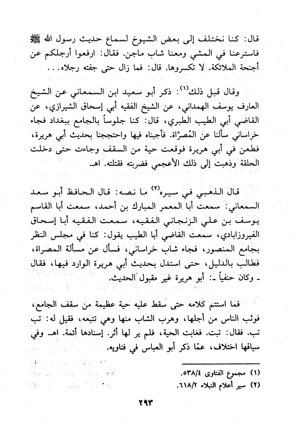 وقال قبل ذلك: (¬1) ذكر: أبو سعيد بن السمعاني عن الشيخ العارف يوسف الهمداني عن الشيخ الفقيه أبي إسحاق الشيرازي عن القاضي أبي الطيب الطبري قال: كنا جلوسا بالجامع ببغداد فجاء خراساني سألنا عن المصراة. فأجبناه فيها واحتججنا بحديث أبي هريرة فطعن في أبي هريرة فوقعت حية من السقف وجاءت حتى دخلت الحلقة وذهبت إلى ذلك الأعجمي فضربته فقتلته. ا. هـ.